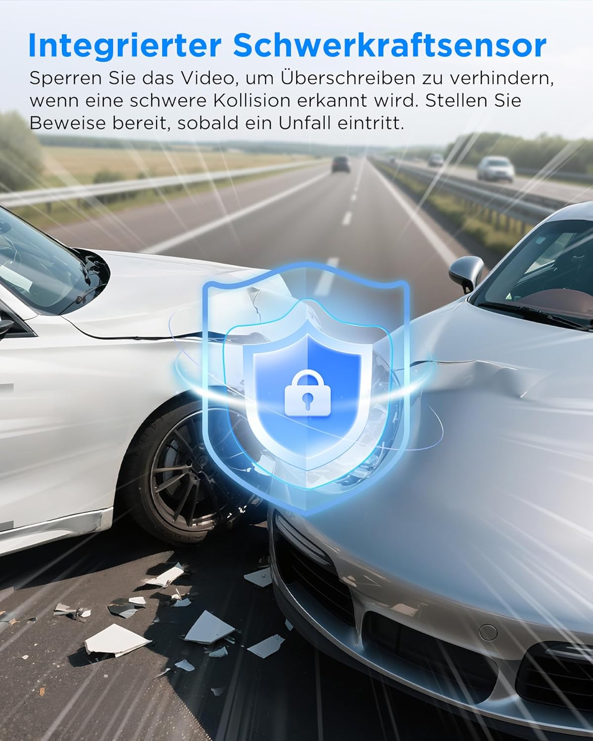 • 【Циклов запис и G-сензор】Автомобилната видеокамера поддържа безпроблемен цикличен запис и автоматично презаписва най-старите файлове, след като паметта се запълни, за да осигури непрекъснат запис. Вграденият G-сензор открива внезапни удари или сблъсъци и запазва записите в отделна папка за събития. Това предотвратява презаписването на важни видеоклипове, защитавайки важни доказателства за застрахователни искове или полицейски доклади.