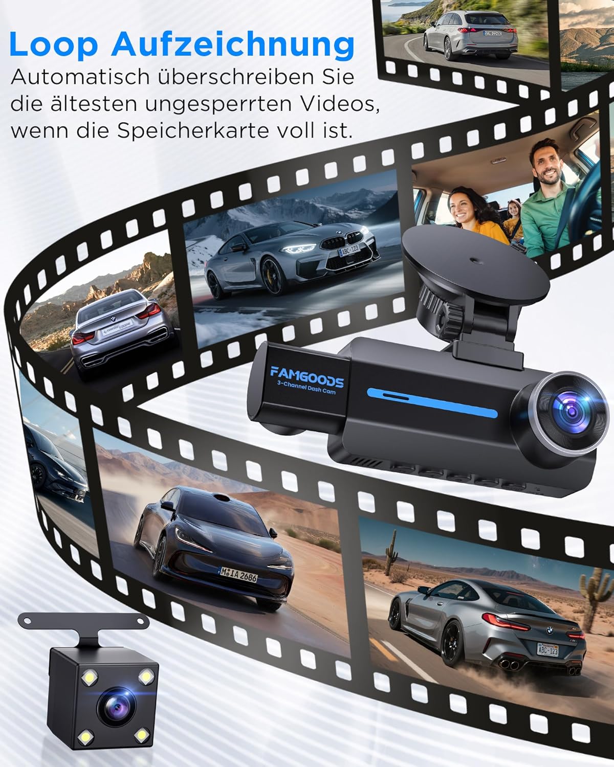 Famgoods Автомобилна видеорегистраторна камера за предно и задно виждане, интериорна, 3-канална, 3.16" IPS екран, 64GB карта, видеорегистратор с наблюдение на паркирането, супер нощно виждане, G-сензор, цикличен запис, 5GHz WiFi, приложение