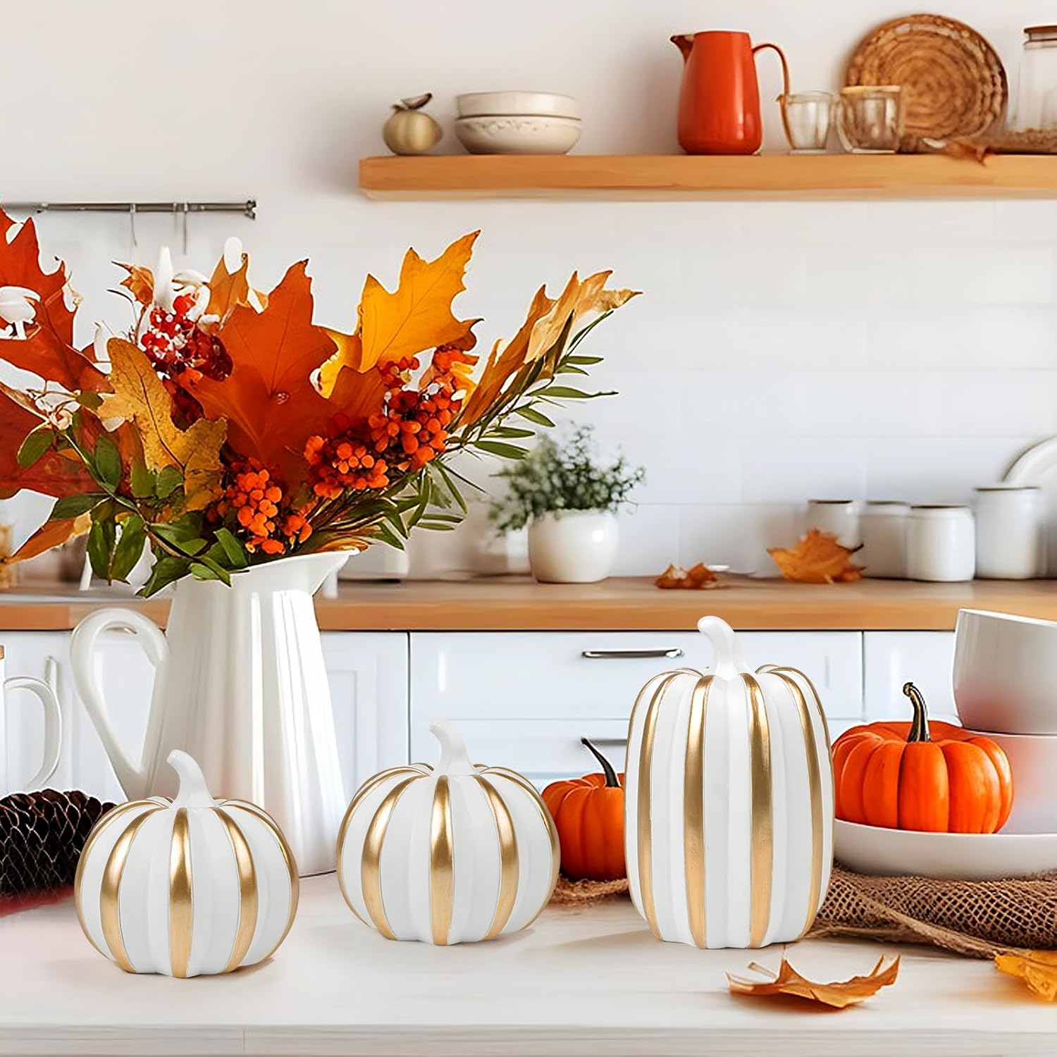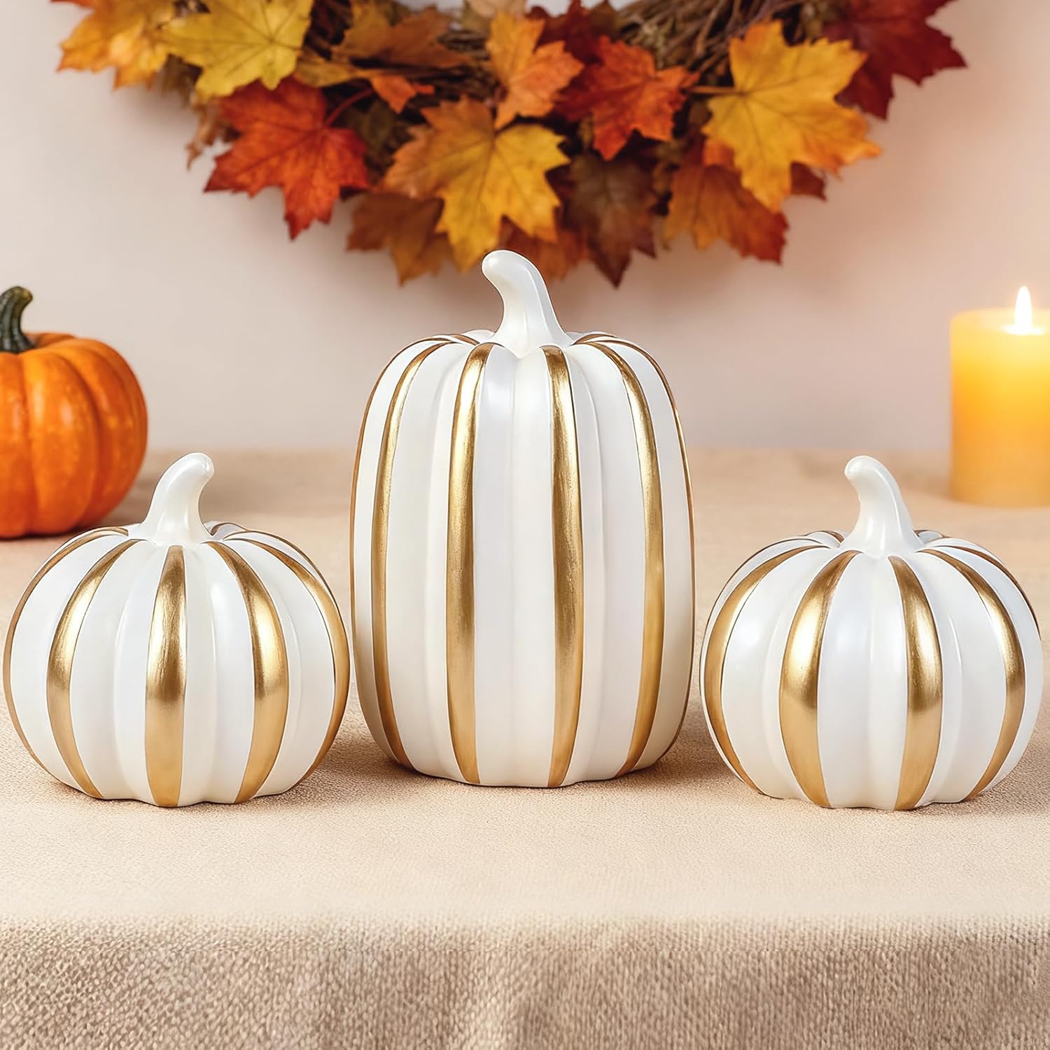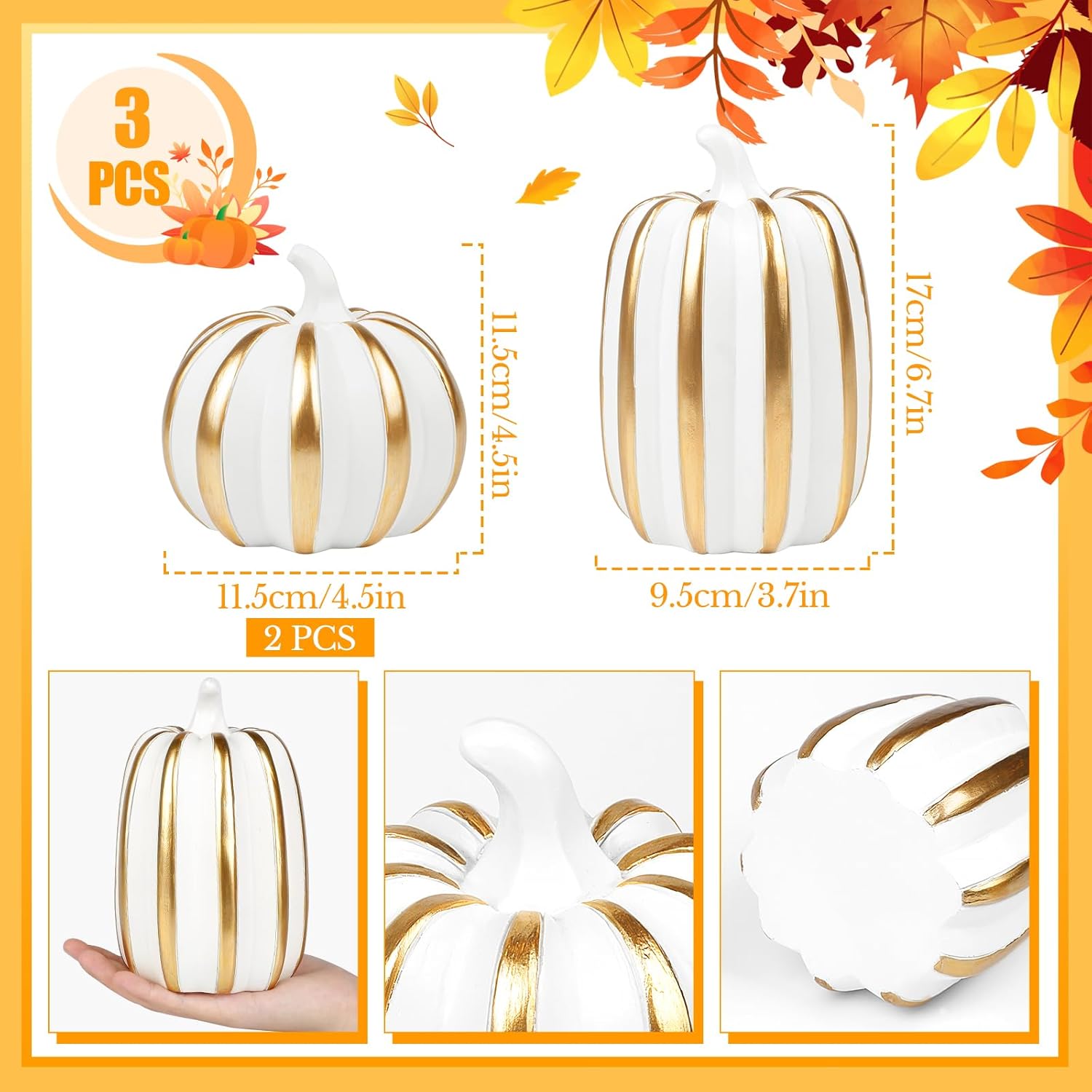 Внесете есенен чар в дома си с този висококачествен комплект от 3 декоративни тикви от смола. Тези вечно елегантни есенни декорации са идеални за различни зони във вашия дом - от камината до верандата и офиса. Богато украсеният дизайн на тиквите добавя топла, приветлива атмосфера към всяка стая и осигурява атмосферен вид на есенна реколта. Здравата конструкция от смола гарантира дълготрайна употреба и прави тиквите практична алтернатива на истинските зеленчуци. Идеални за есенна декорация на маса или като декоративен елемент в кънтри стил. Тези универсални декоративни елементи се съчетават красиво с други есенни декорации и създават уютна атмосфера във вашия дом.