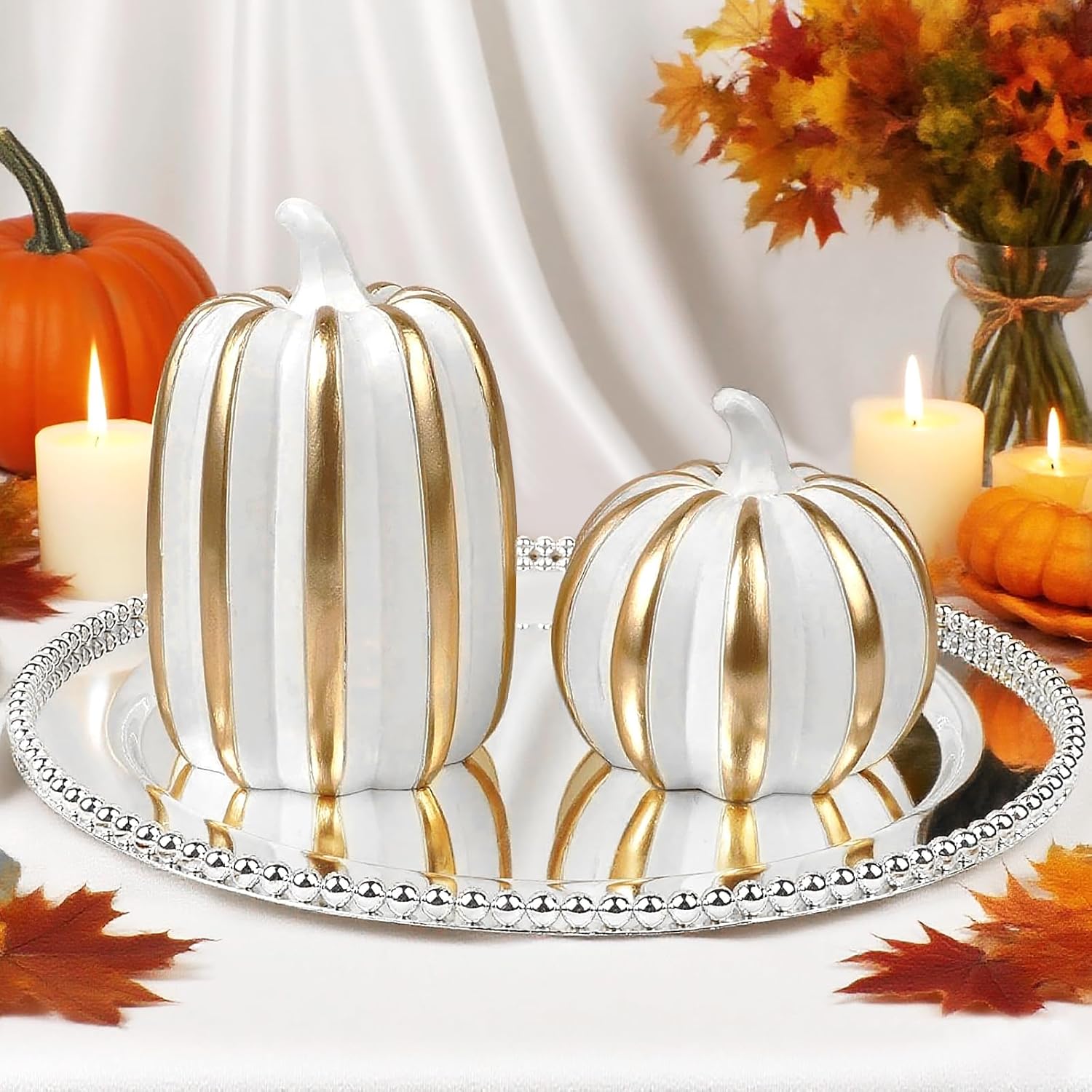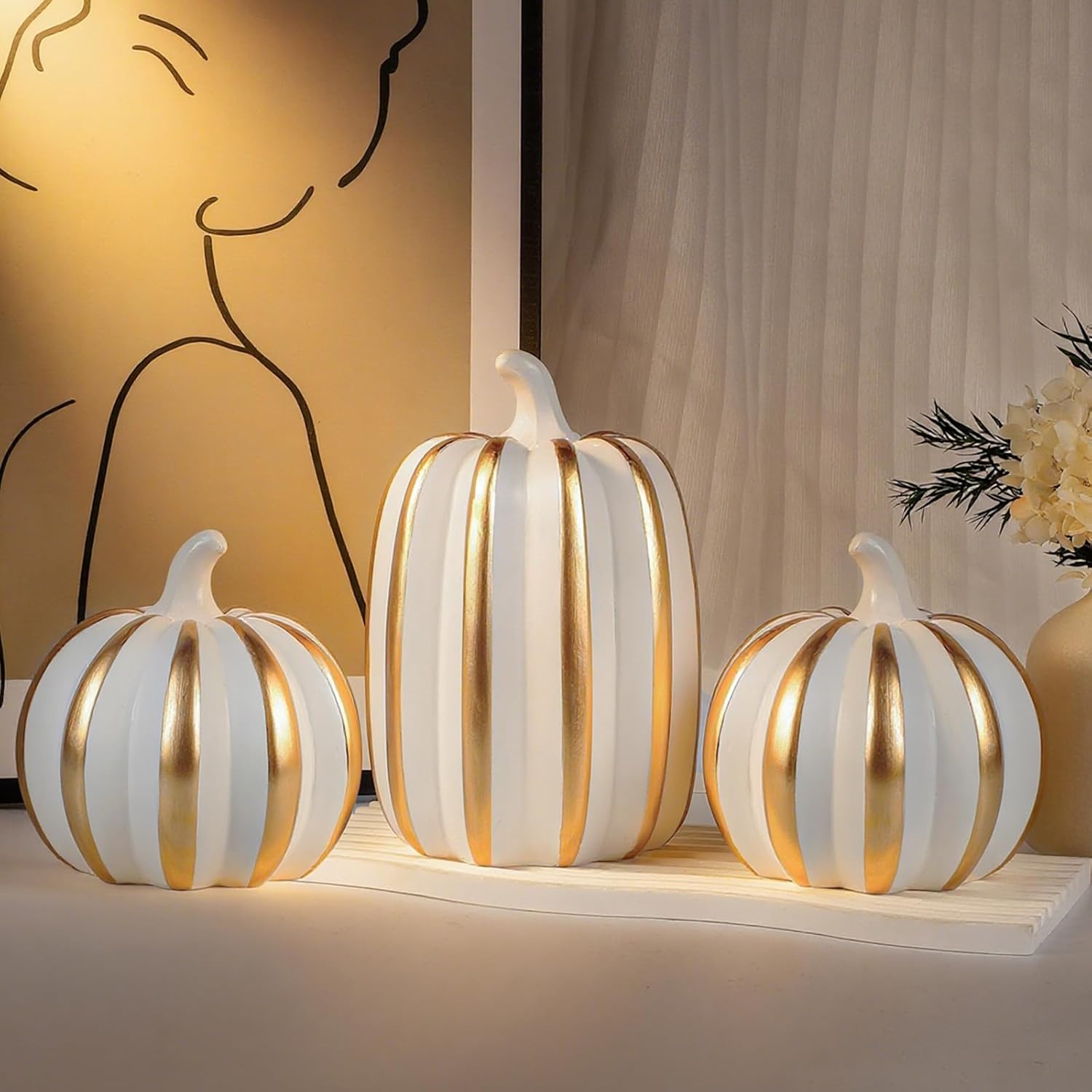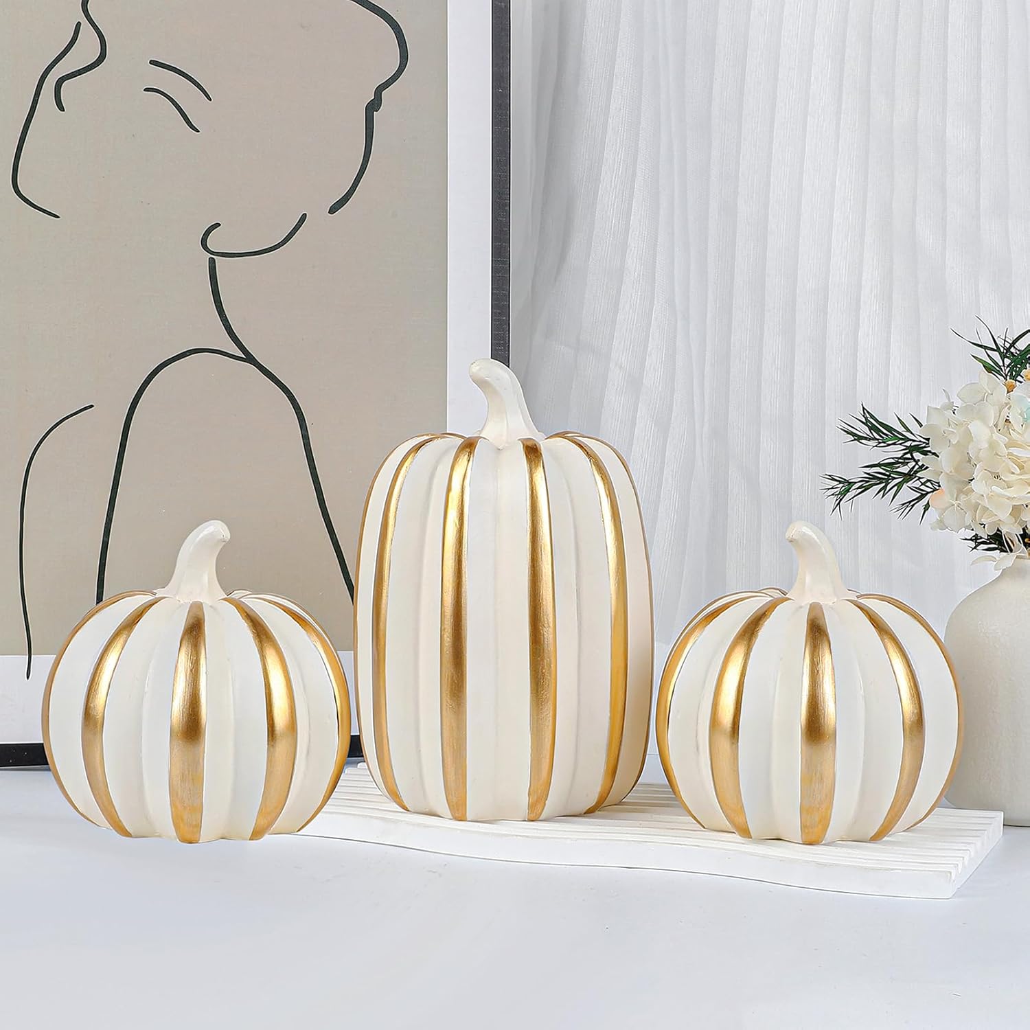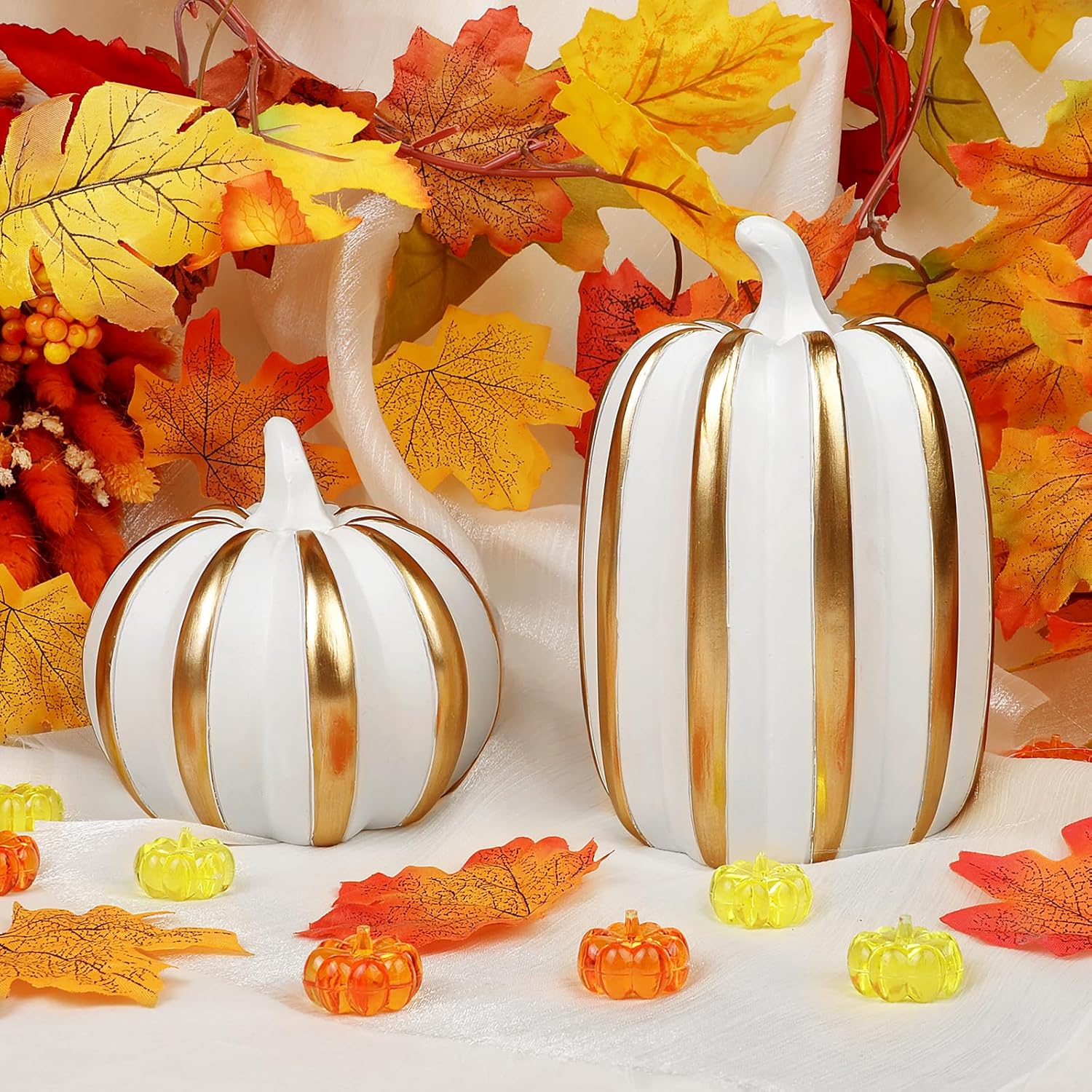 Внесете есенен чар в дома си с този висококачествен комплект от 3 декоративни тикви от смола. Тези вечно елегантни есенни декорации са идеални за различни зони във вашия дом - от камината до верандата и офиса. Богато украсеният дизайн на тиквите добавя топла, приветлива атмосфера към всяка стая и осигурява атмосферен вид на есенна реколта. Здравата конструкция от смола гарантира дълготрайна употреба и прави тиквите практична алтернатива на истинските зеленчуци. Идеални за есенна декорация на маса или като декоративен елемент в кънтри стил. Тези универсални декоративни елементи се съчетават красиво с други есенни декорации и създават уютна атмосфера във вашия дом.