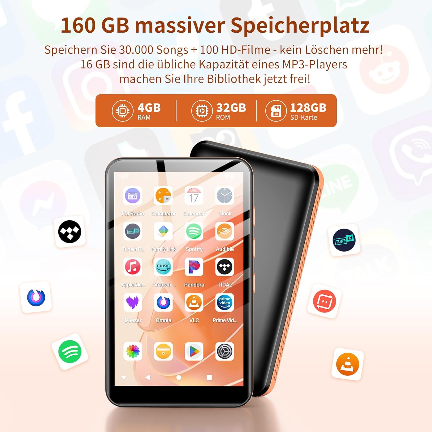 • 160 GB голяма памет: Bluetooth MP3 плейърът има 4 GB RAM и 160 GB място за съхранение (32 GB ROM + 128 GB micro SD карта) и поддържа разширяване на външна памет до 512 GB. Така че можете лесно да съхранявате хиляди музикални записи, а голямата памет на MP3 устройството задоволява нуждата ви от съхранение на повече песни, видеоклипове, аудиокниги и снимки.