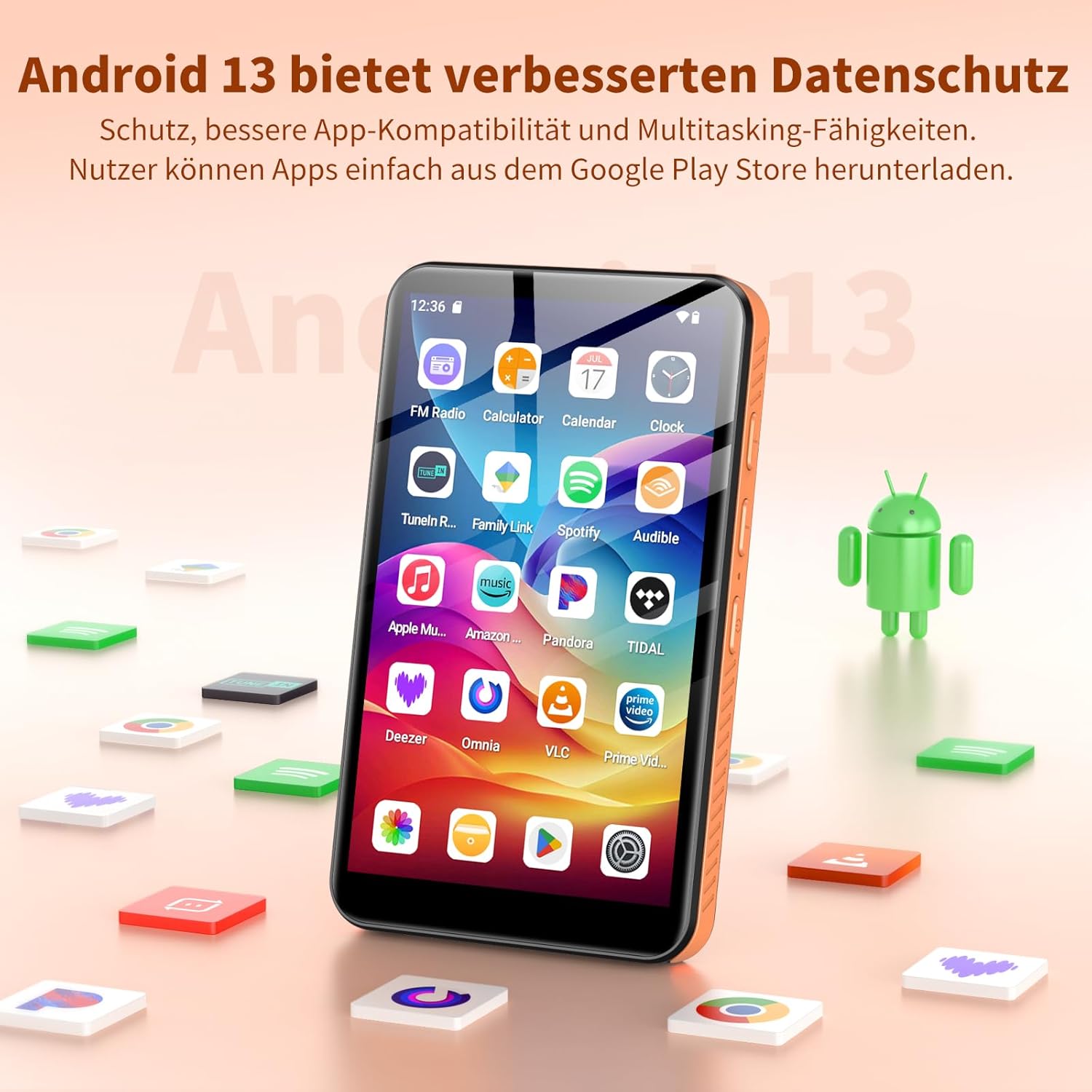 • MP3 музикален плейър с Android 13: MP3 плейърът с Android 13 OS и 8-ядрен MTK процесор осигурява безпроблемно потребителско изживяване, достъп до голяма колекция от приложения, много по-добро изживяване при персонализиране на интерфейса, контрол на производителността и живот на батерията. Предварително инсталирани са много от най-популярните онлайн музикални приложения, включително Spotify, Omnia, Deezer, Amazon Music, Play Store, FM Radio и др.