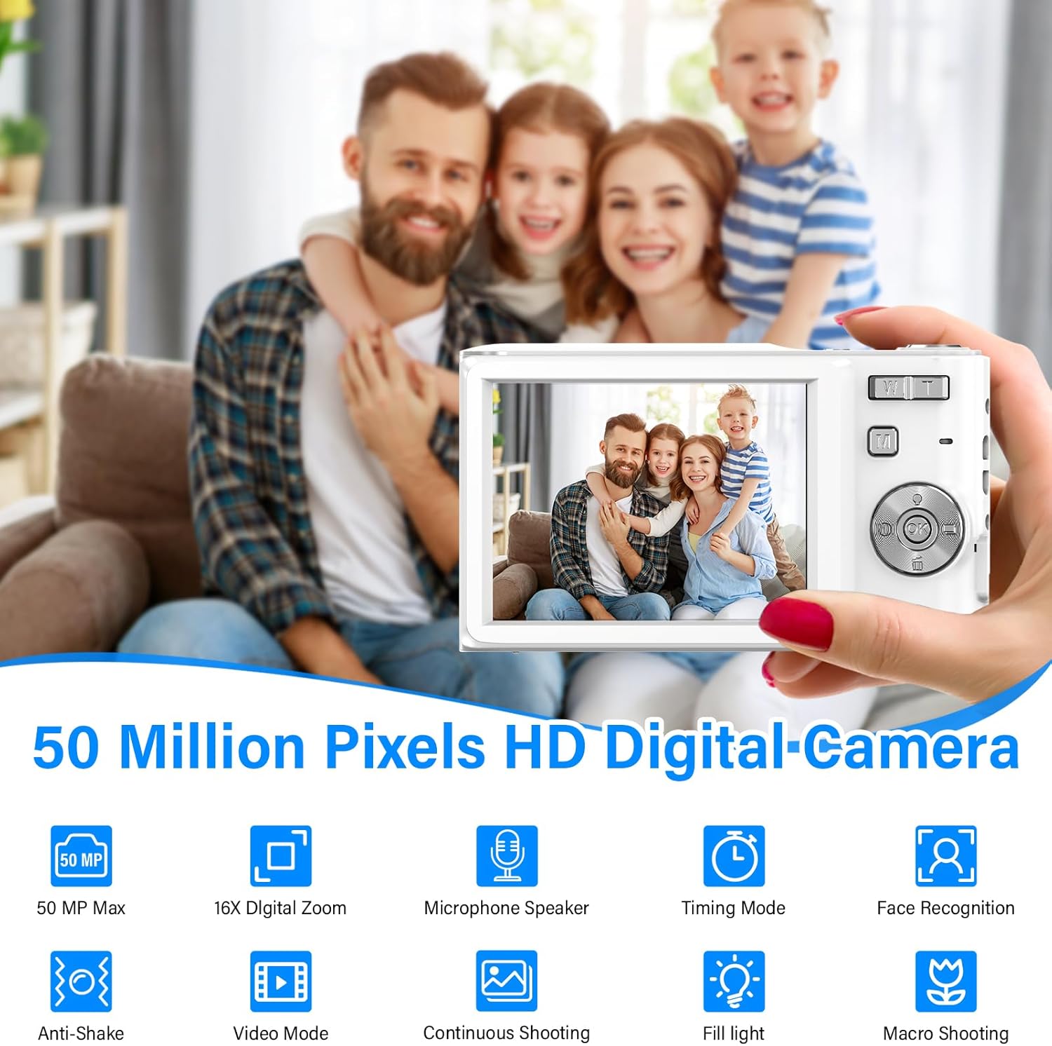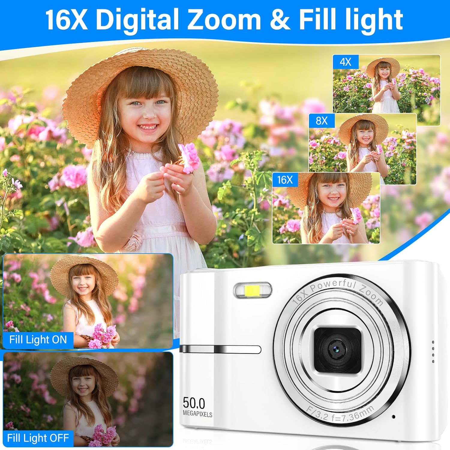 FAYIBUY Цифров фотоапарат 50MP 1080P FHD Фотоапарат с автофокус 16X Цифров зум Камера Преносим компактен фотоапарат с 32GB SD карта за деца, тийнейджъри, начинаещи, подарък (бял)