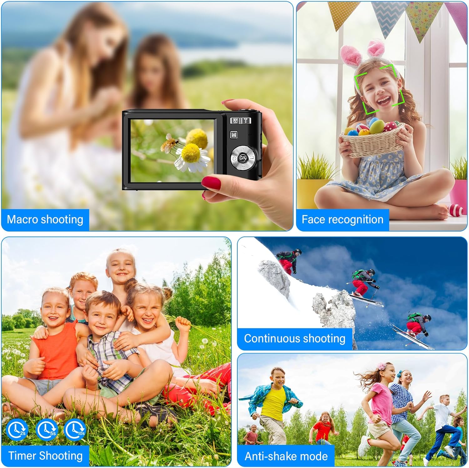 • Многофункционален перфектен подарък: компактният фотоапарат е оборудван със стабилизиране на изображението, заснемане на усмивка, непрекъснато снимане, запис с ускорен кадър, множество филтри, разпознаване на лица, запълваща светлина и други функции. В микрофона и високоговорителя (можете да записвате оригинални звуци), добавяйте различни фонове или специални ефекти, които можете да видите и изберете в настройките. Това е най-добрият подарък за вашето семейство. Дайте на децата си перфектния инструмент за снимане, за да развият креативността си.
