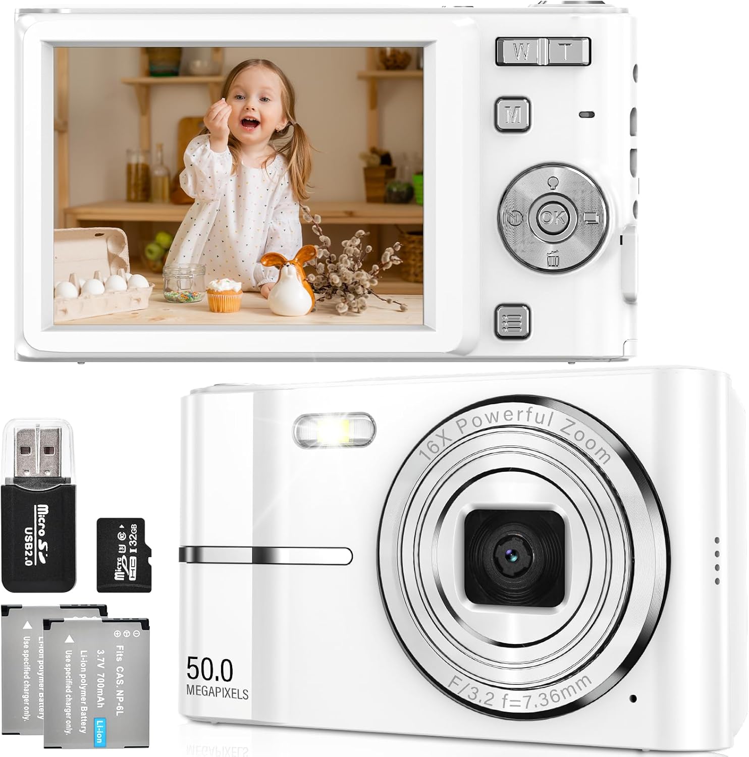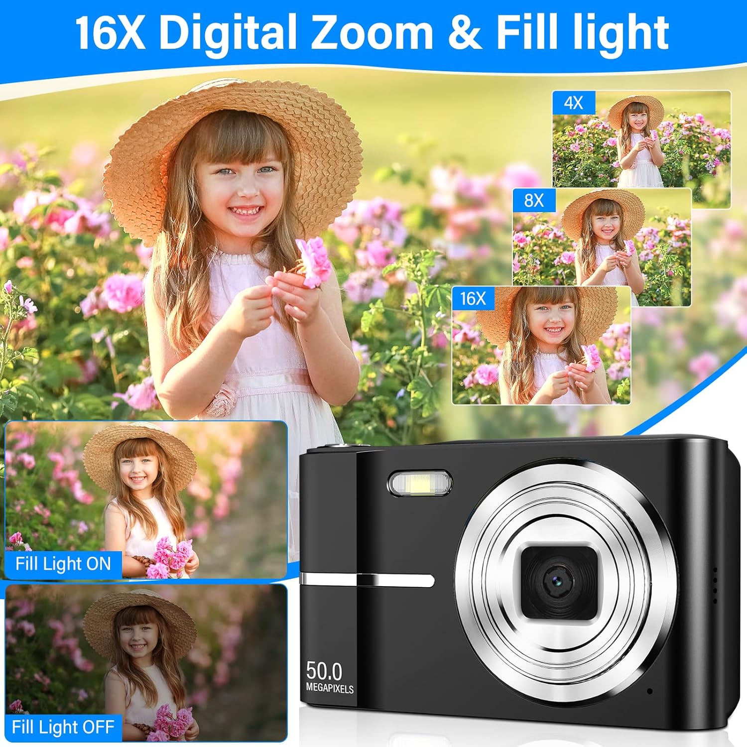 FAYIBUY Цифров фотоапарат 50MP 1080P FHD Фотоапарат с автофокус 16X Цифров зум Камера Преносим компактен фотоапарат с 32GB SD карта за деца, тийнейджъри, начинаещи, подарък (черен)