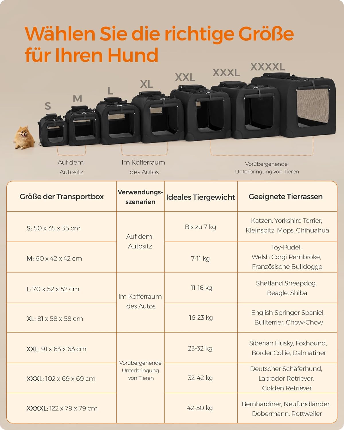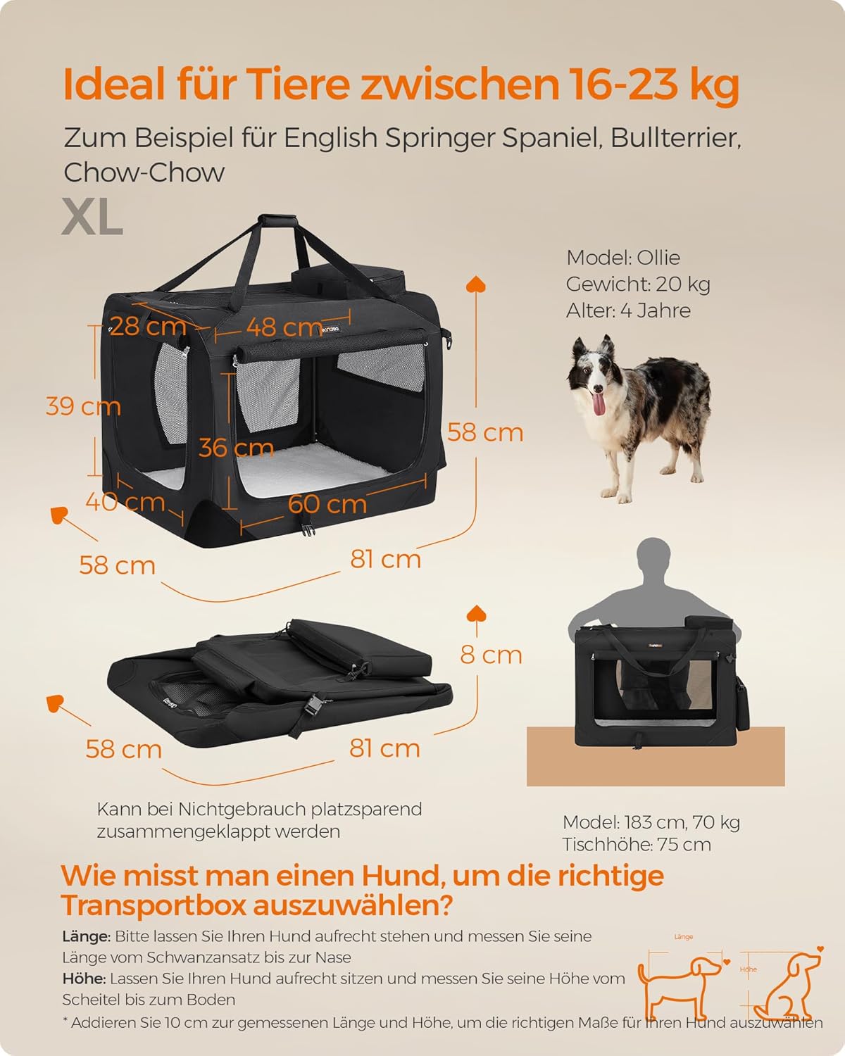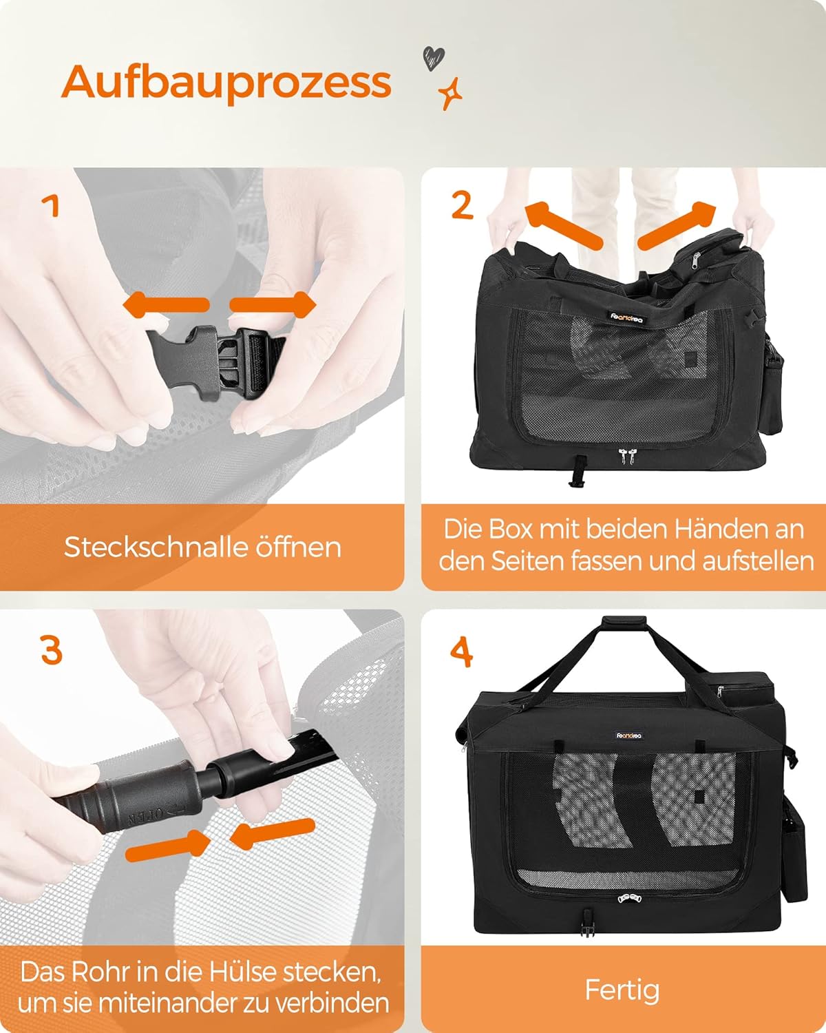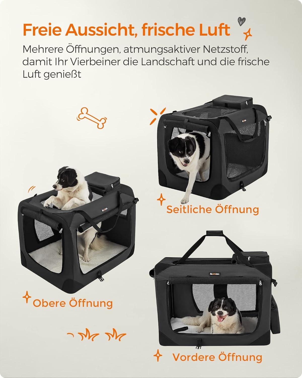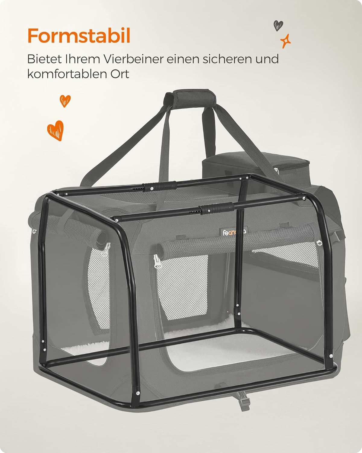 Вътрешността на чантата е подсилена с метална рамка с дебелина 19 мм. Поради това кутията е особено стабилна и издръжлива, така че дори лапите на вашето куче не могат да я наранят.