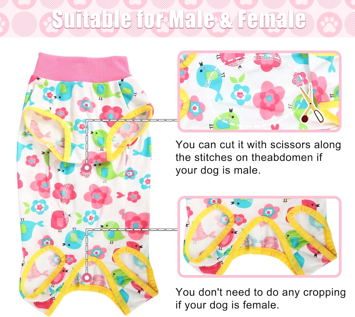 • Универсален за мъжки и женски кучета: Долната страна на този кучешки костюм е снабдена с кръгли отвори за урина, които могат да се изрязват според нуждите, за да се улесни дефекацията на вашето куче, без да се налага да сваляте целия следоперативен костюм.