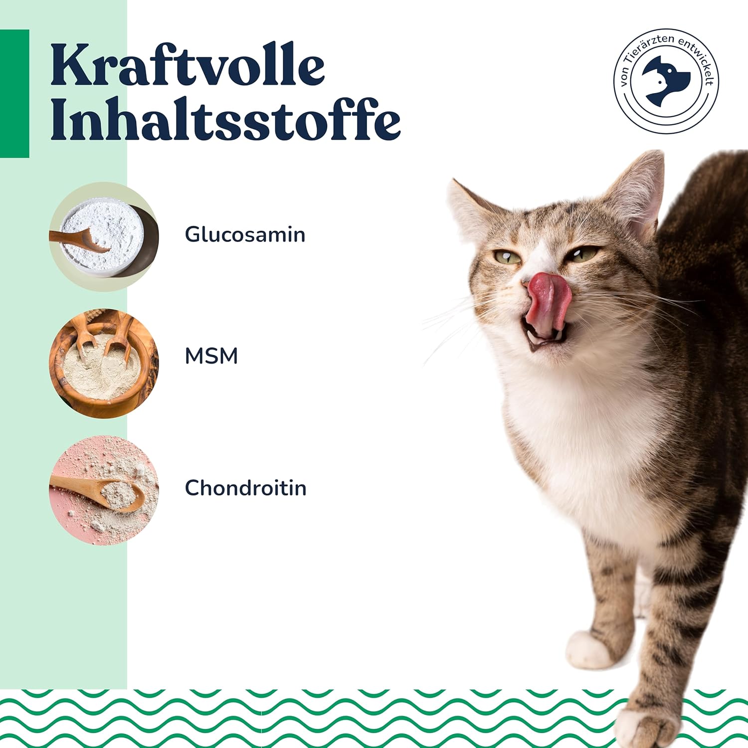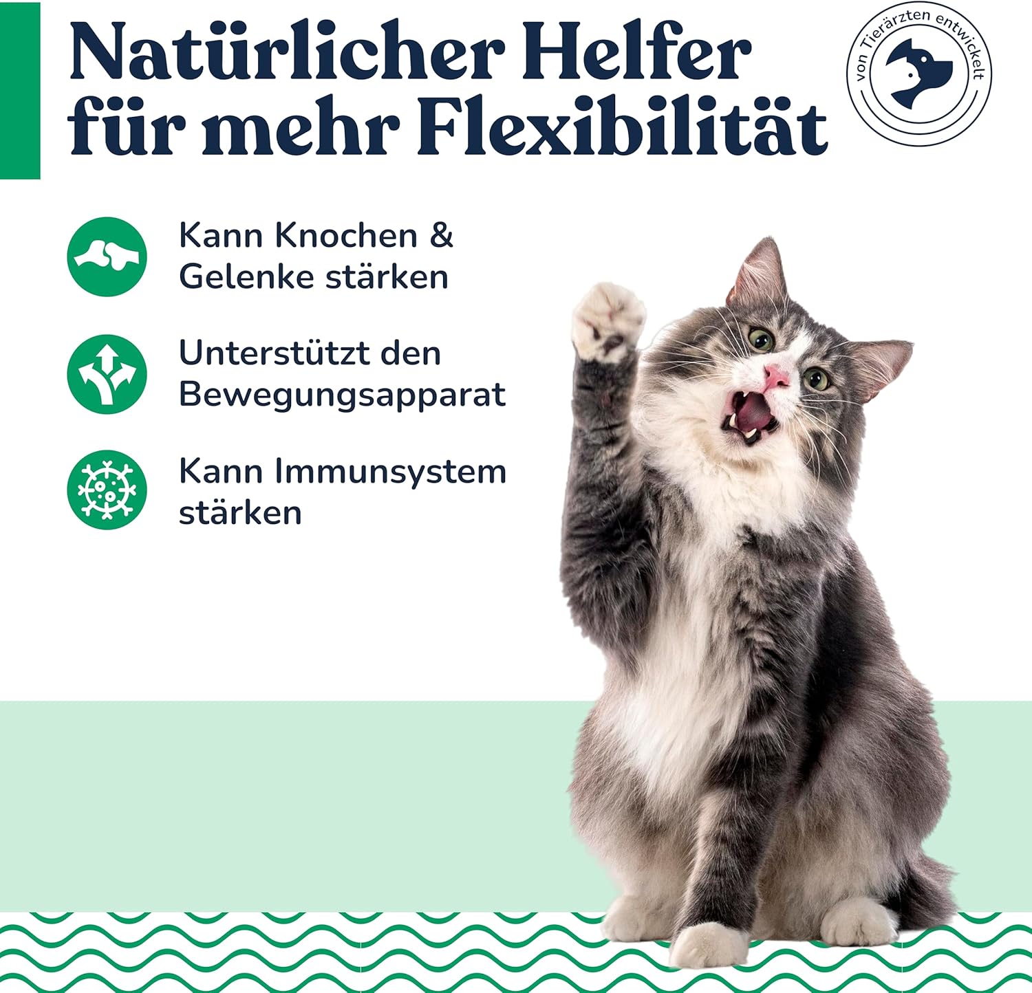 • ИЗБРАНИ СЪСТАВКИ ЗА ГРИЖА ЗА СТАВИТЕ: Тази паста за стави за котки съдържа глюкозамин, хондроитин, МСМ и дяволски нокът, комбинирани с масла и мазнини. Тези съставки се използват в храненето на животните за опорно-двигателния апарат и са подходящи за котки от всички възрасти – дори за възрастни котки.