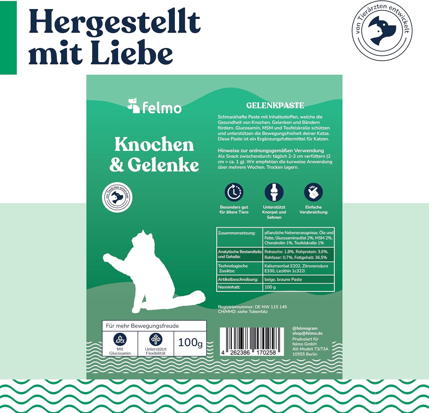 • РАЗРАБОТЕНО ОТ ВЕТЕРИНАРНИ ЛЕКАРИ: Нашите формули са разработени в сътрудничество с ветеринарни лекари и са базирани на натурални съставки и балансирани формули. Паста за стави Felmo предлага лесен начин за смислено допълване на диетата на вашата котка – идеална за ежедневна употреба.