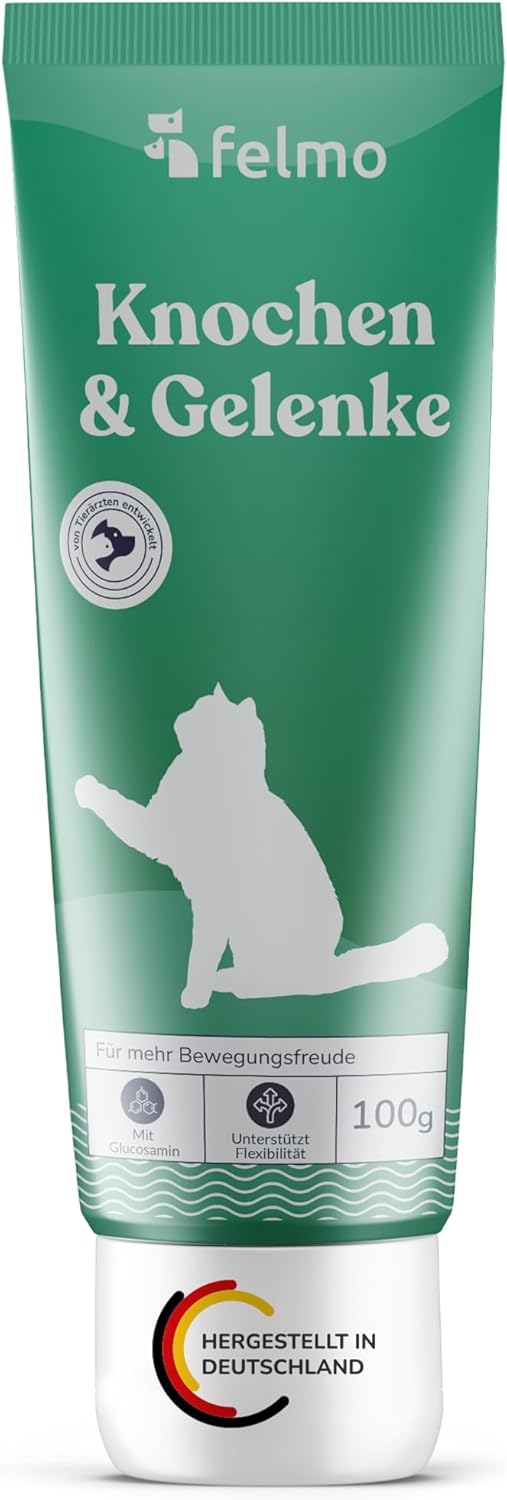 Felmo Паста за кости и стави за котки с глюкозамин, хондроитин, МСМ и Дяволски нокът – малцова паста в туба от 100 г, без захар и произведена в Германия от внимателно подбрани съставки.