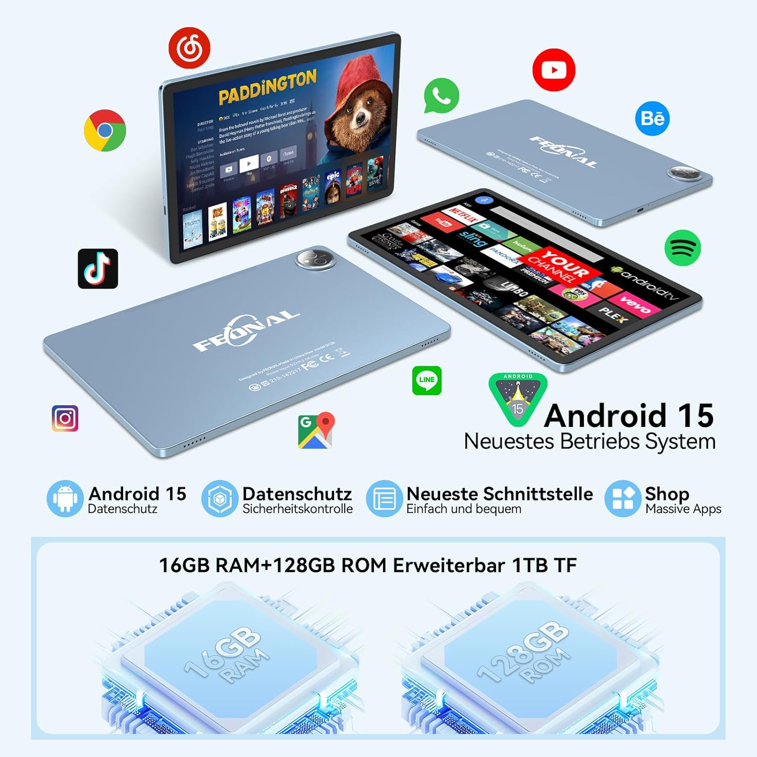 • [16 (8+8) GB RAM + 128GB ROM + 1TB разширяема голяма памет] Таблетът Android 15 разполага с 16GB (8GB физическа разширена + 8GB виртуална) RAM + 128GB ROM вътрешна памет с поддръжка на 1TB разширена памет (SD/TF картата не е включена). Таблетът FEONAL ви позволява да съхранявате голям брой приложения, електронни книги, филми, снимки, видеоклипове, игри и други за всички ваши ежедневни нужди. Можете да запазите цялото си любимо съдържание, без да се налага да го изтривате.