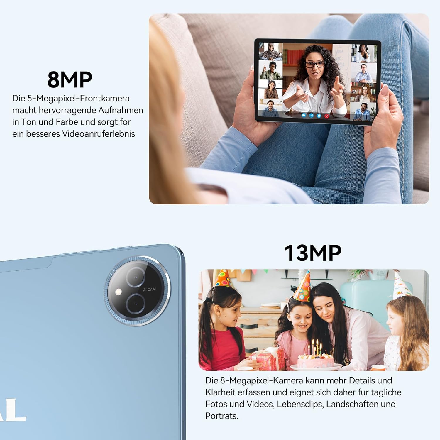 • [13 MP Rückkamera + 8 MP Frontkamera mit Gesichtsentsperrung]Das 5G WiFi-Tablet verfügt über eine integrierte 13-MP-Rückkamera und eine 8-MP-Frontkamera, um Ihnen ein hervorragendes Video- und Fotoerlebnis zu bieten - perfekt, um all Ihre großartigen Momente festzuhalten und jedes Ereignis in exquisiten Details zu dokumentieren, sei es im Alltag oder auf Reisen. Die Verwendung für Online-Kurse und Schulaufgaben ist ebenfalls eine gute Option. Die Face Unlock-Funktion ermöglicht einen nahtlosen, sicheren Zugang, schützt die Privatsphäre vor unbefugten Blicken und ermöglicht Ihnen einen einfachen Zugriff auf Ihr Wifi-Tablet.