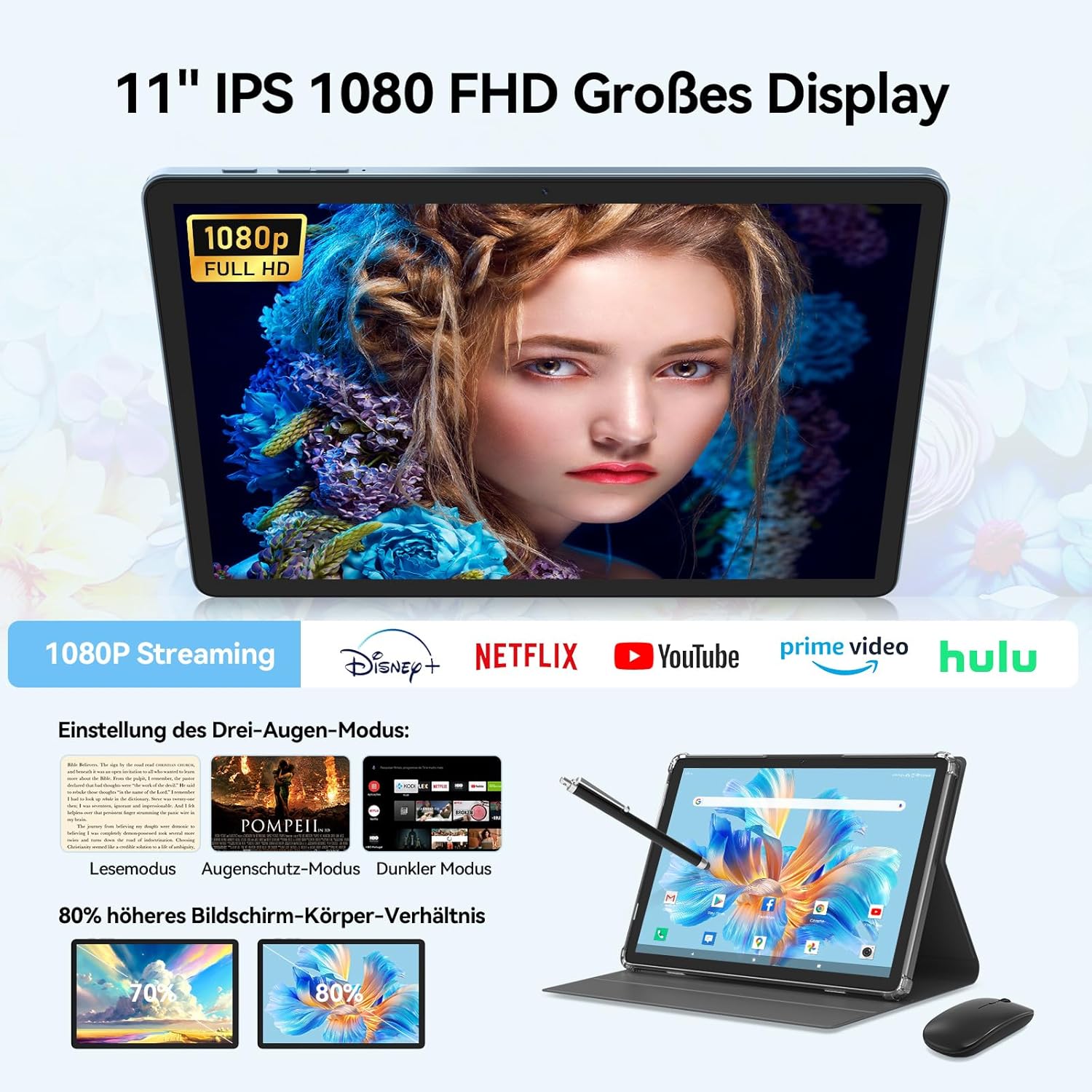 • [Новообработен 11-инчов голям екран] Този 11-инчов таблет разполага с вграден дисплей с 1080p HD резолюция и двойни стерео високоговорители за отлично аудиовизуално изживяване и забавление. Android таблетът поддържа безжично проектиране, което ви позволява да проектирате екрана си върху по-голям екран за забавление и работа. Той предлага и три удобни режима: режим на четене, режим на защита на очите и тъмен режим. Тези режими ви позволяват да използвате този Android таблет за продължителни периоди без умора и ви осигуряват по-релаксиращо изживяване при гледане.