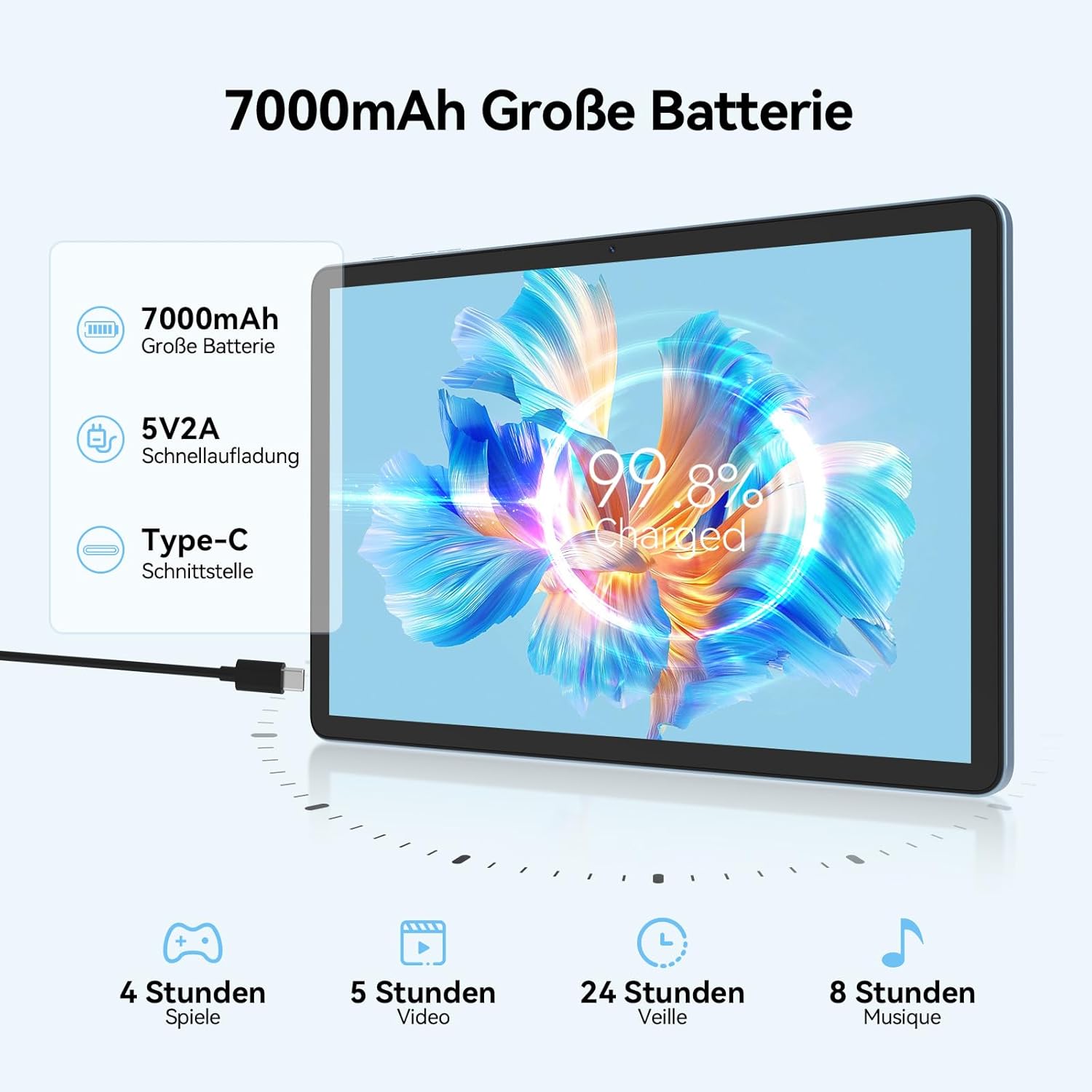 • [7000mAh батерия с голям капацитет и бързо зареждане Type-C] Този Android таблет е оборудван с батерия с голям капацитет 7000mAh с време на готовност до 480 часа, така че можете да го вземете навсякъде, без да се притеснявате, че ще ви свърши батерията. С USB Type-C кабел и бързо зареждане чрез 5V Wi-Fi можете удобно да зареждате устройството навсякъде. Дългото време за четене и показване на информация ви позволява да се наслаждавате на любимите си дейности и приложения за по-дълго време.