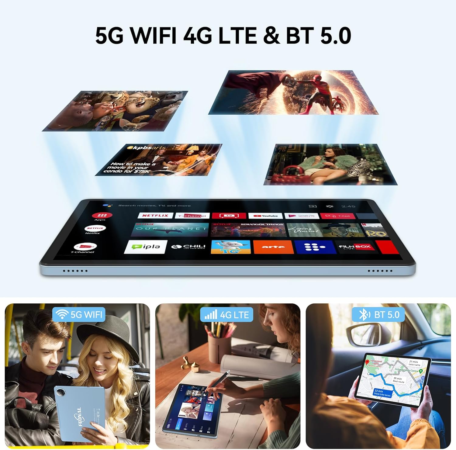 • [Двойна 4G LTE, WiFi 2.4G/5G + Bluetooth 5.0] Този 4G мобилен таблет разполага с два слота за SIM карти (SIM картата не е включена) и поддържа 4G LTE функционалност, което ви позволява да работите и живеете свободно, като превключвате между мрежи, осъществявате едновременни разговори и поддържате VoLTE. Останете свързани и се забавлявайте с високоскоростен двубандов 2.4Ghz/5Ghz Wi-Fi и високоефективна безжична връзка Bluetooth 5.0. Независимо къде се намирате, 11-инчов таблет с клетъчна и WiFi свързаност е по-удобен от WiFi таблет.