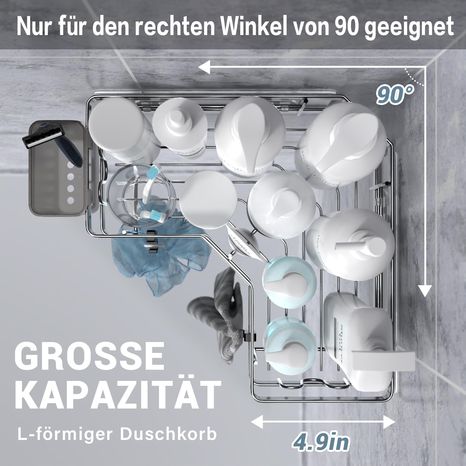 • L-образен ъглов рафт за баня: Душовият рафт без пробиване е с дизайн под прав ъгъл от 90°, който е идеално пригоден за ъгъл от 90°, а огъването на ъгъла е максимално. Ъгловата душ кабина има отворена решетка за максимална циркулация на въздуха и дренаж. Рафтът за баня може да организира повечето тоалетни принадлежности в банята, много практично място за съхранение и организация.
