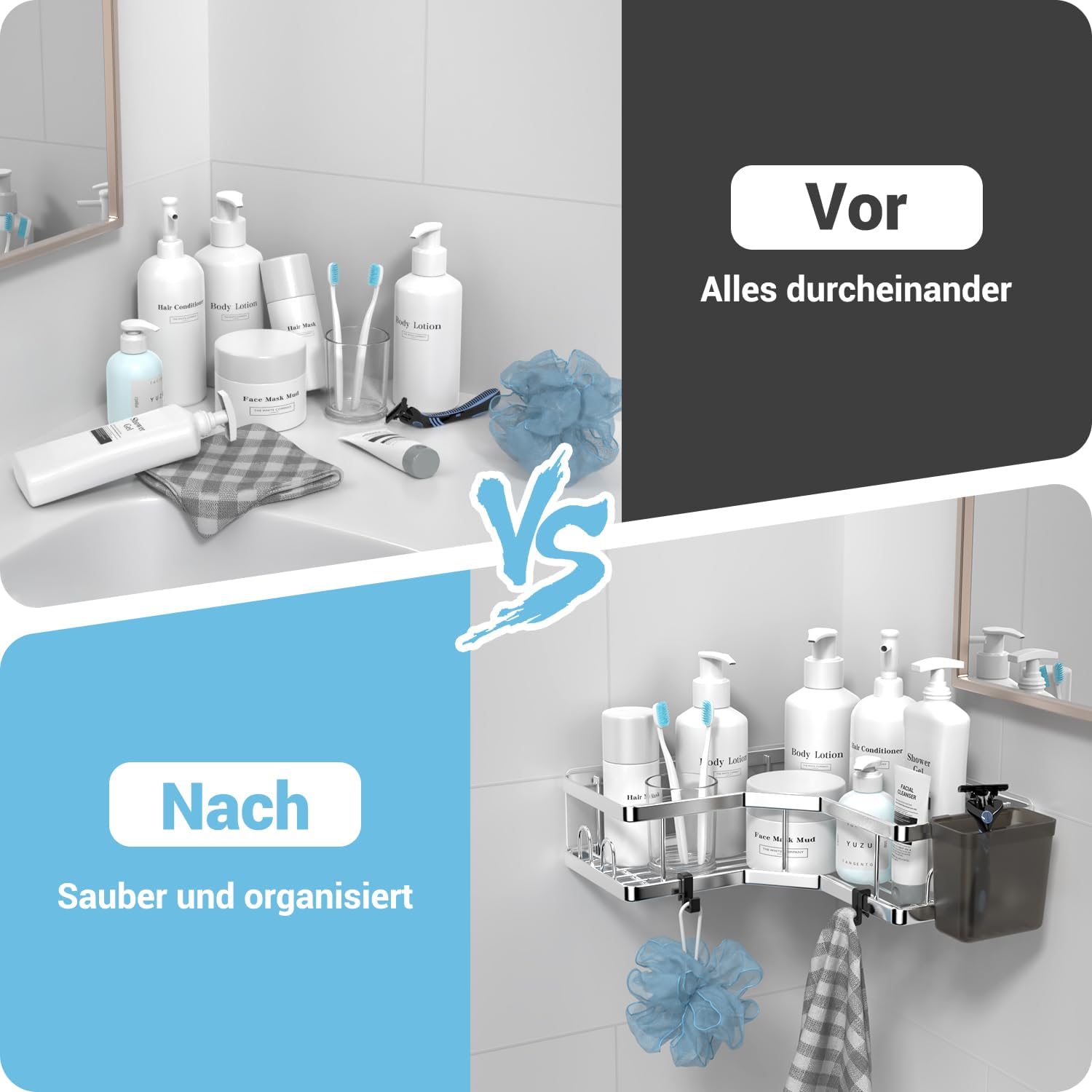 • Супер лепило и голям капацитет: Лепилото е супер лепкаво за плоски повърхности и осигурява здраво задържане до 18 кг. Душовото корито е много стабилно, може да съхранява сапун, шампоан, почистващ препарат за лице, лосион и т.н. В допълнение, 4 кукички и 2 държача за паста за зъби могат да поберат кърпи, хавлии за баня, бомби за вана, четка за зъби и паста за зъби. Душовият рафт FINIBO спестява място и поддържа нещата подредени.
