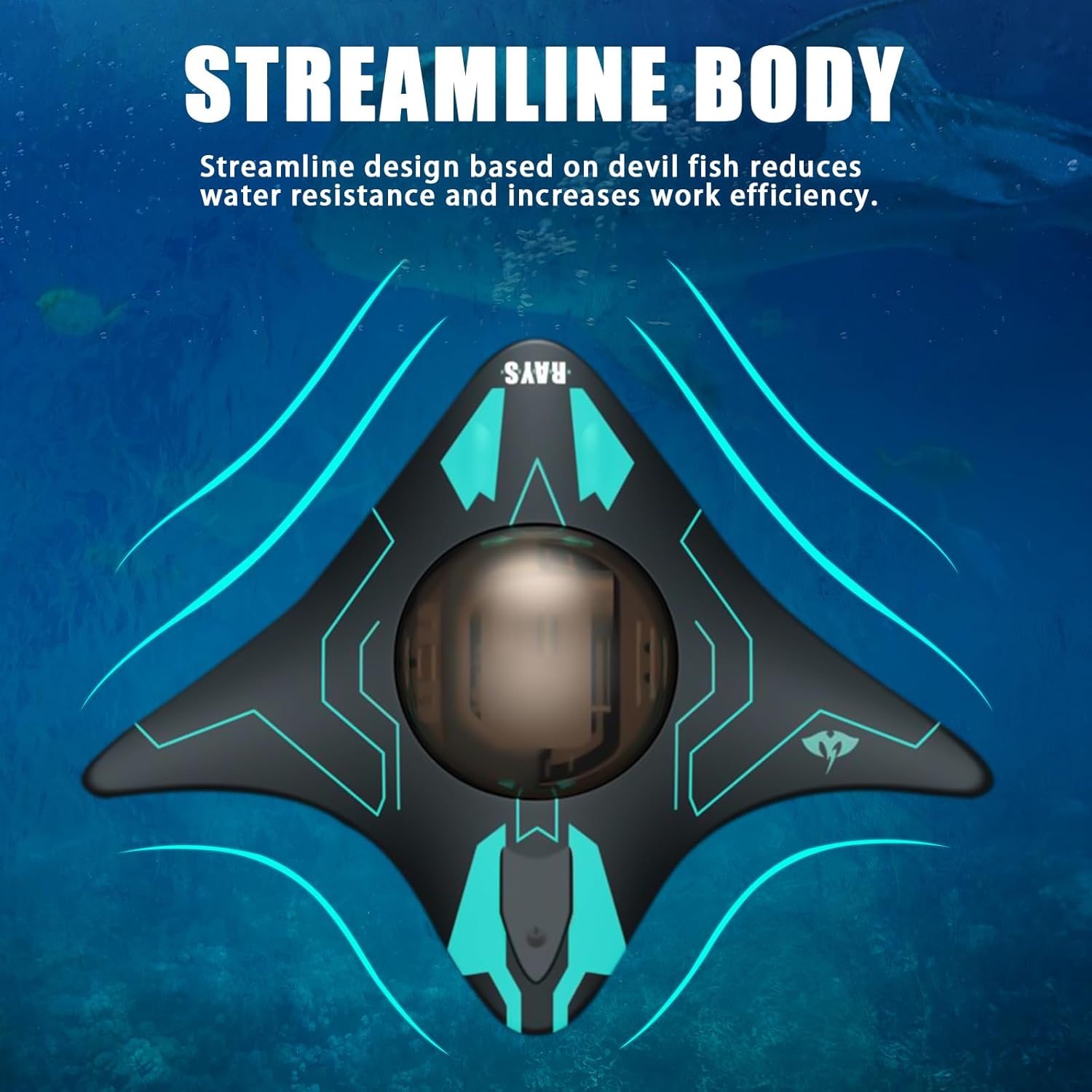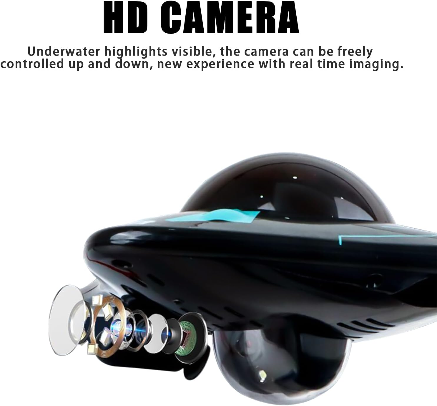 • Опростено тяло: Вдъхновено от рибата дявол, лекото и компактно тяло намалява съпротивлението на водата, така че лодката с камера може лесно да достигне целта си. Подходящо е за среди като басейни, езера и аквариуми и ви предлага идеално изживяване при запис.