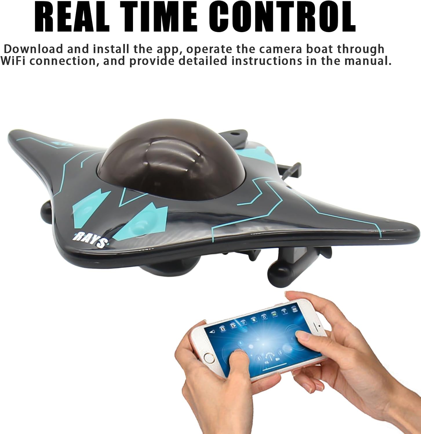 • Незабавен контрол: Тази водоустойчива лодка с камера и дистанционно управление е съвместима със системи Android и iPhone. Просто сканирайте QR кода, за да изтеглите и инсталирате приложението и лесно управлявайте лодката чрез WiFi връзка. Тя ви отвежда на ново пътешествие, за да изследвате подводния свят и предлага повече възможности за забавление.