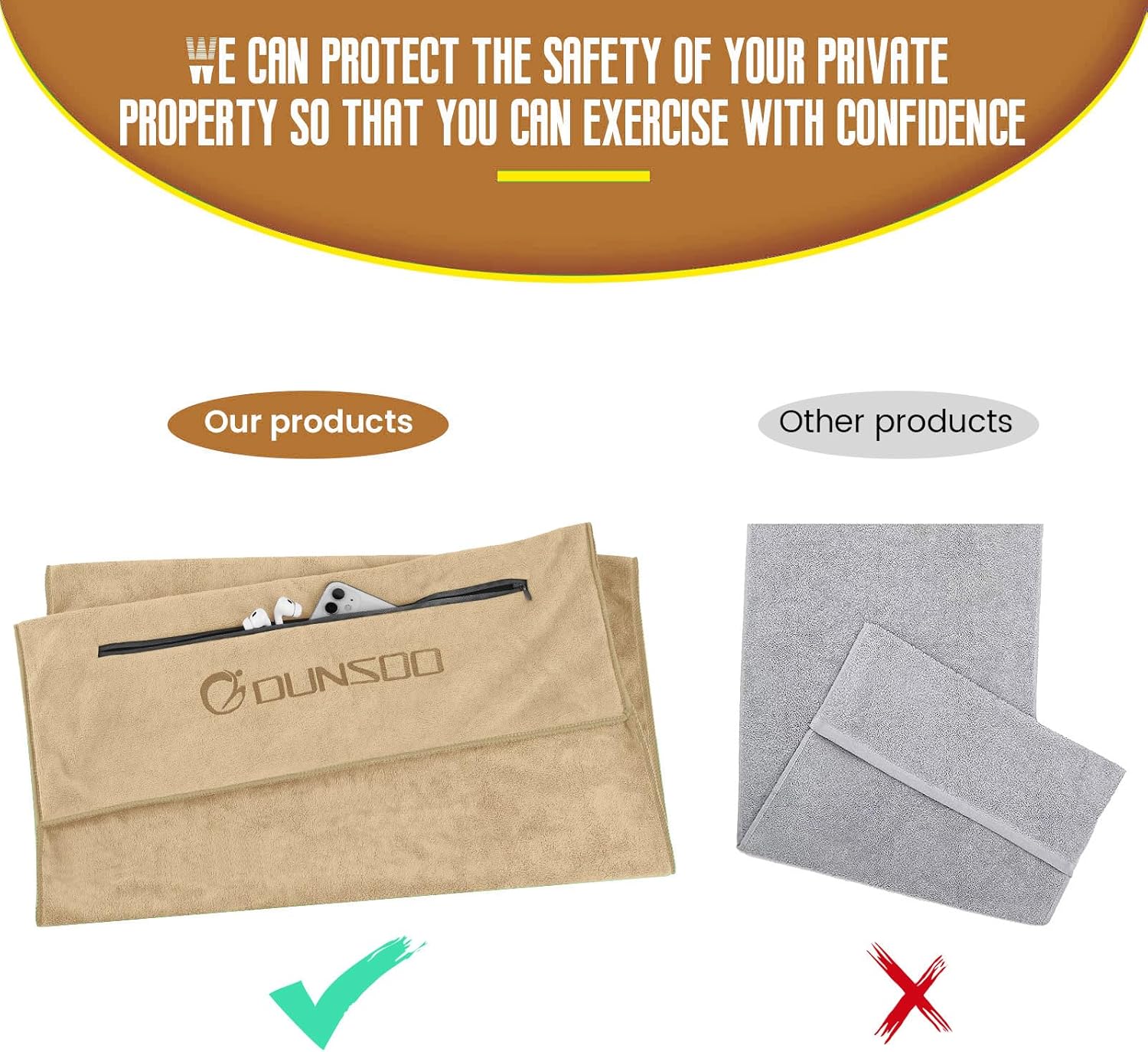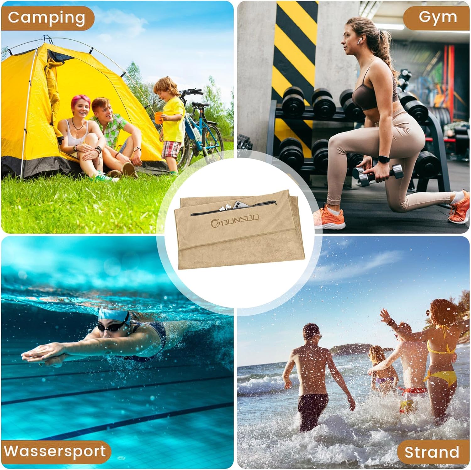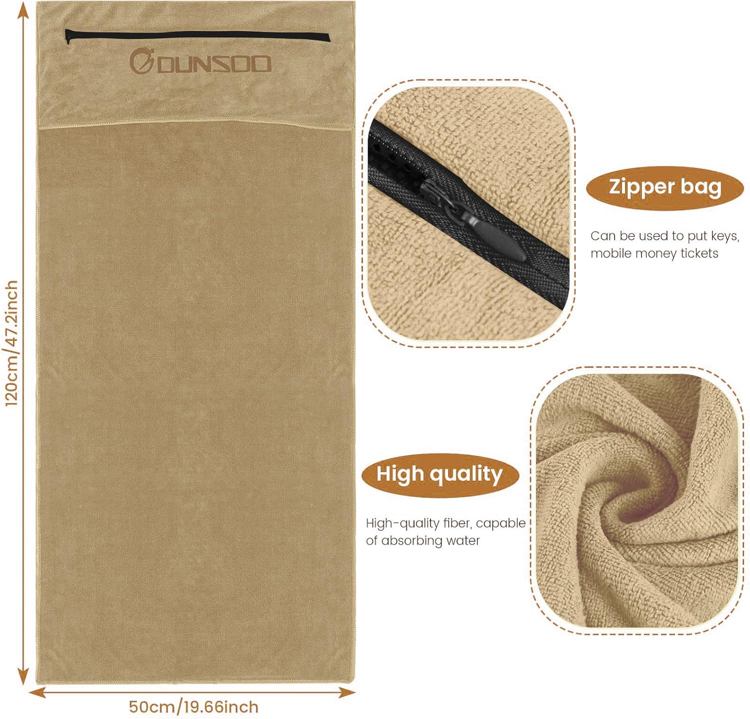 Фитнес кърпа, 120 x 50 см, Микрофибърна спортна кърпа с джоб с цип за фитнес и тренировки, Фитнес кърпа (Camel)
