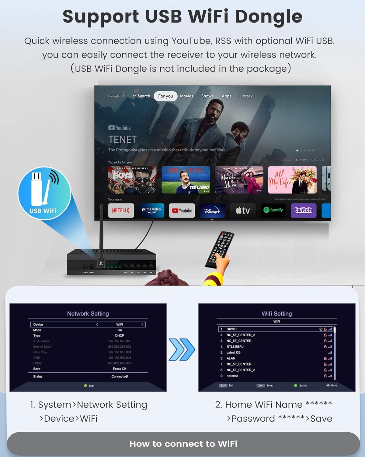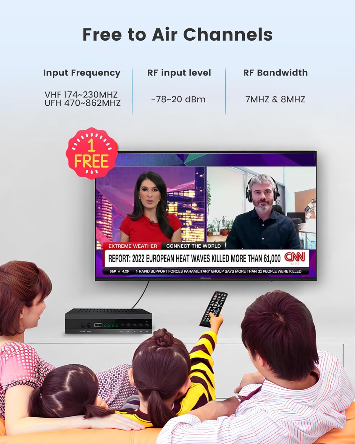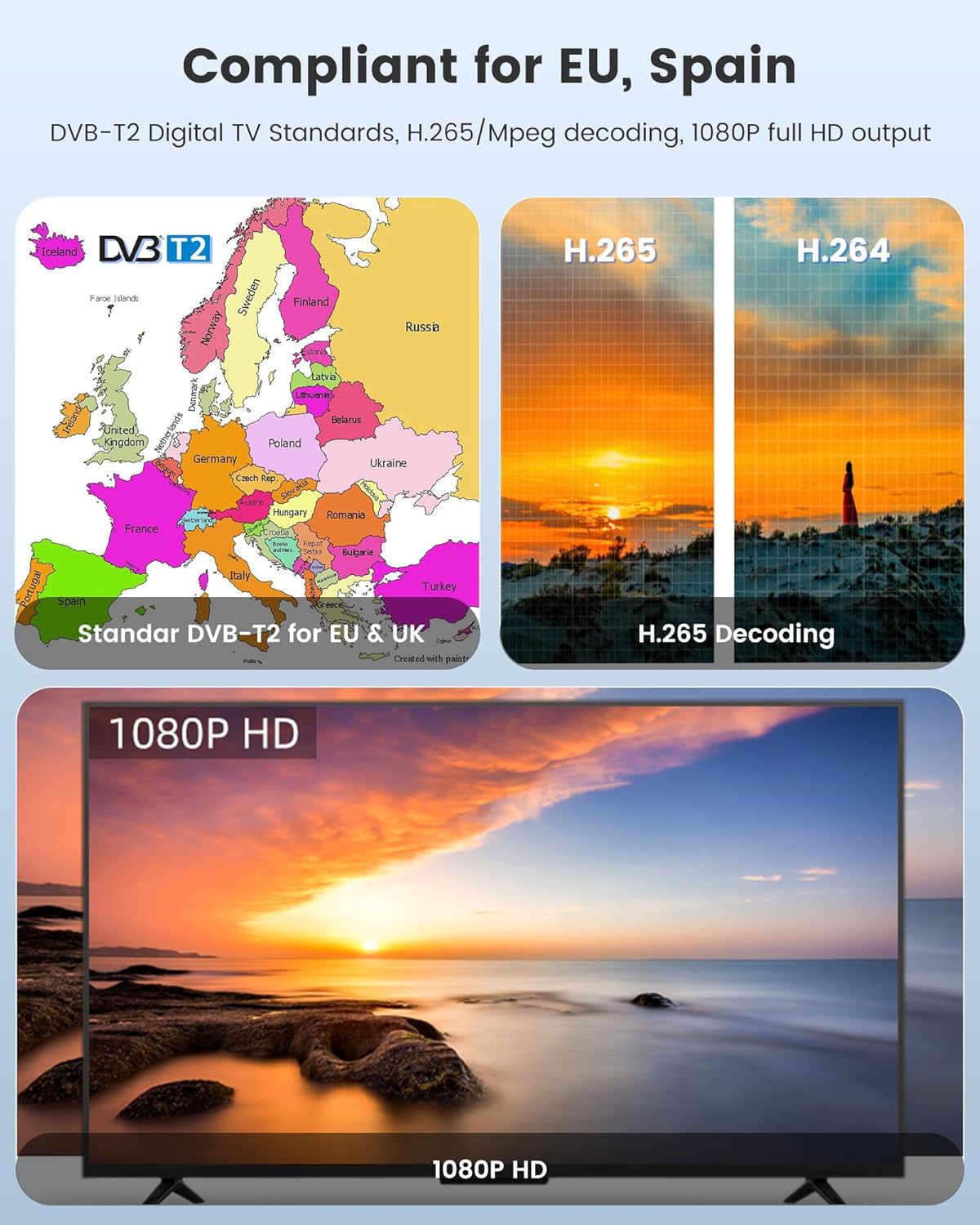 Discover the new era of TV with the FIYAPOO DVB HD HDMI. The FIYAPOO DVB HD HDMI decoder takes the viewing experience to a new level with its Full HD 1080p image quality and DVB-T2 H265 HEVC technology. This device ensures sharp and clear images that bring every detail to life. Versatile connectivity Equipped with HDMI and SCART ports, it fits modern and older TVs. The USB port allows direct playback of multimedia content from storage devices. PVR recording function With the built-in PVR function, you can record your favourite shows and watch them at any time. The USB port makes it easy to store and organise your recordings. Compatibility and Efficiency It is compatible with MPEG-2 and MPEG-4 formats, ensuring efficient transmission and storage. In addition, the compact and modern design can be easily integrated into any living environment. Easy installation and use: the installation of the FIYAPOO TDT HD HDMI is simple and its intuitive user interface makes it easy to navigate through its functions and makes it accessible to everyone. Energy Efficiency With its low power consumption, this decoder is environmentally friendly without compromising on performance. The FIYAPOO TDT HD HDMI is not only a decoder, it is the door to a first-class TV experience. It offers high image quality, connectivity options, advanced recording and efficient design. Enhance your home entertainment with the FIYAPOO TDT HD HDMI and enjoy the new era of TV.