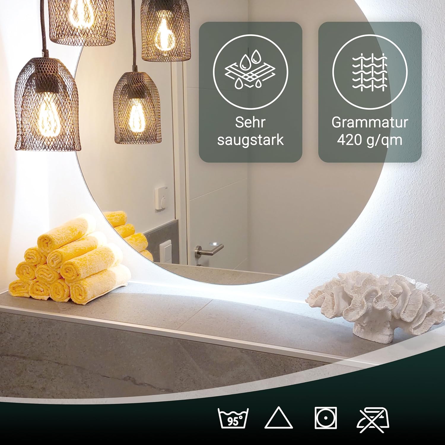 Абсорбиращите постелки за баня впечатляват с най-високата си устойчивост на цветовете. Благодарение на боядисването с индантрен, хавлиените кърпи постигат най-високи стойности за устойчивост на цветовете и най-добра стабилност на цветовете, могат да се перат до 95°C и дори са устойчиви на кипене и хлор.