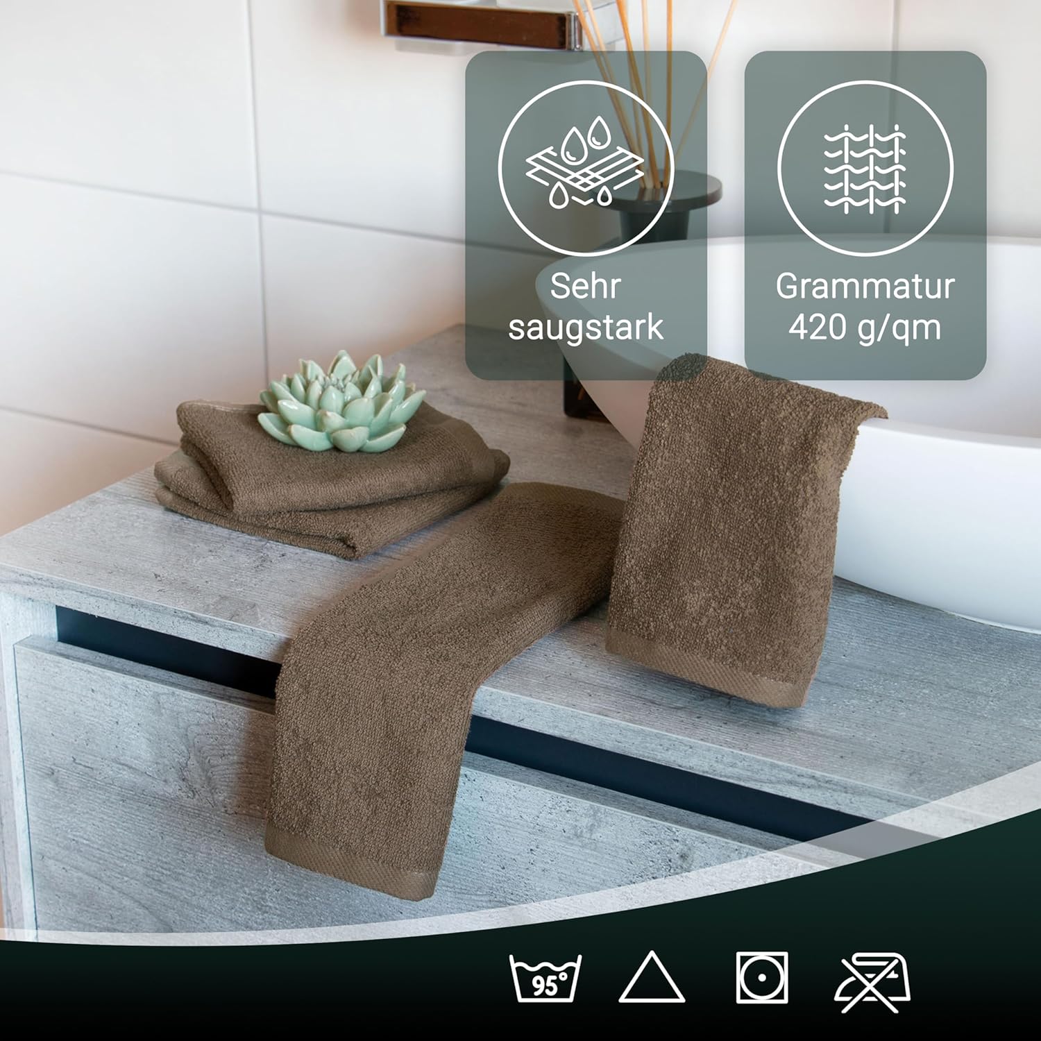 Индантреновият цвят гарантира на кърпите за гости най-високи стойности за устойчивост на цветовете и най-добра стабилност на цветовете, те могат да се перат до 95°C и дори са устойчиви на варене и хлор.