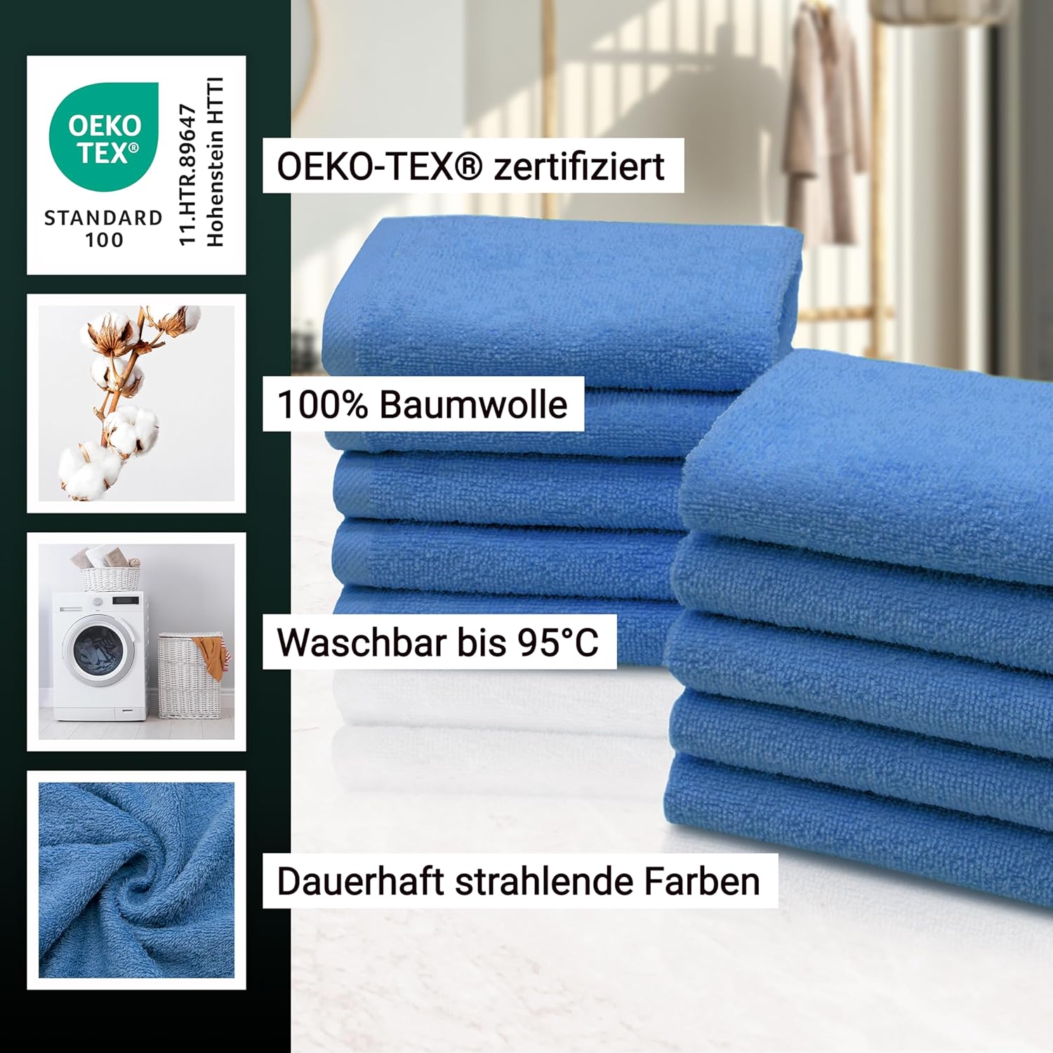 Индантреновият цвят гарантира на кърпите за гости най-високи стойности за устойчивост на цветовете и най-добра стабилност на цветовете, те могат да се перат до 95°C и дори са устойчиви на варене и хлор.