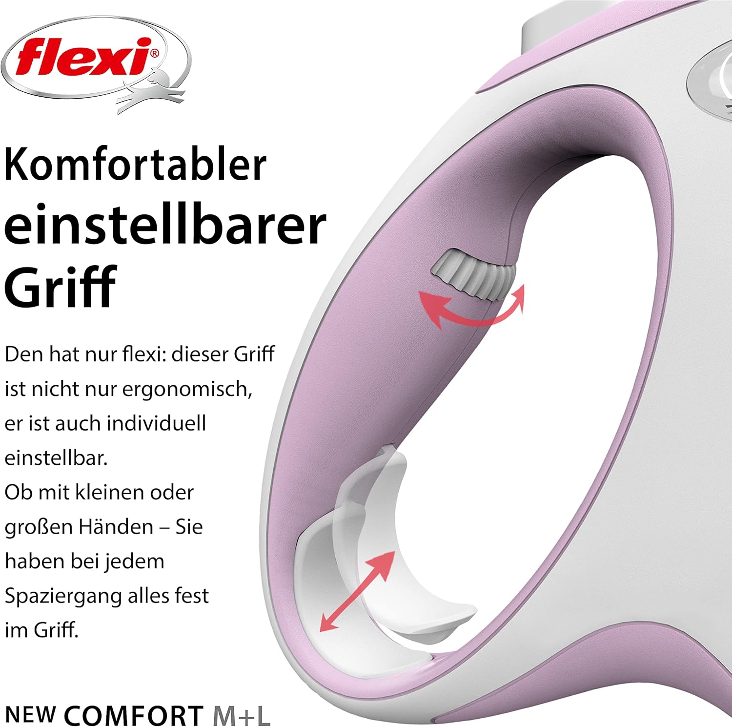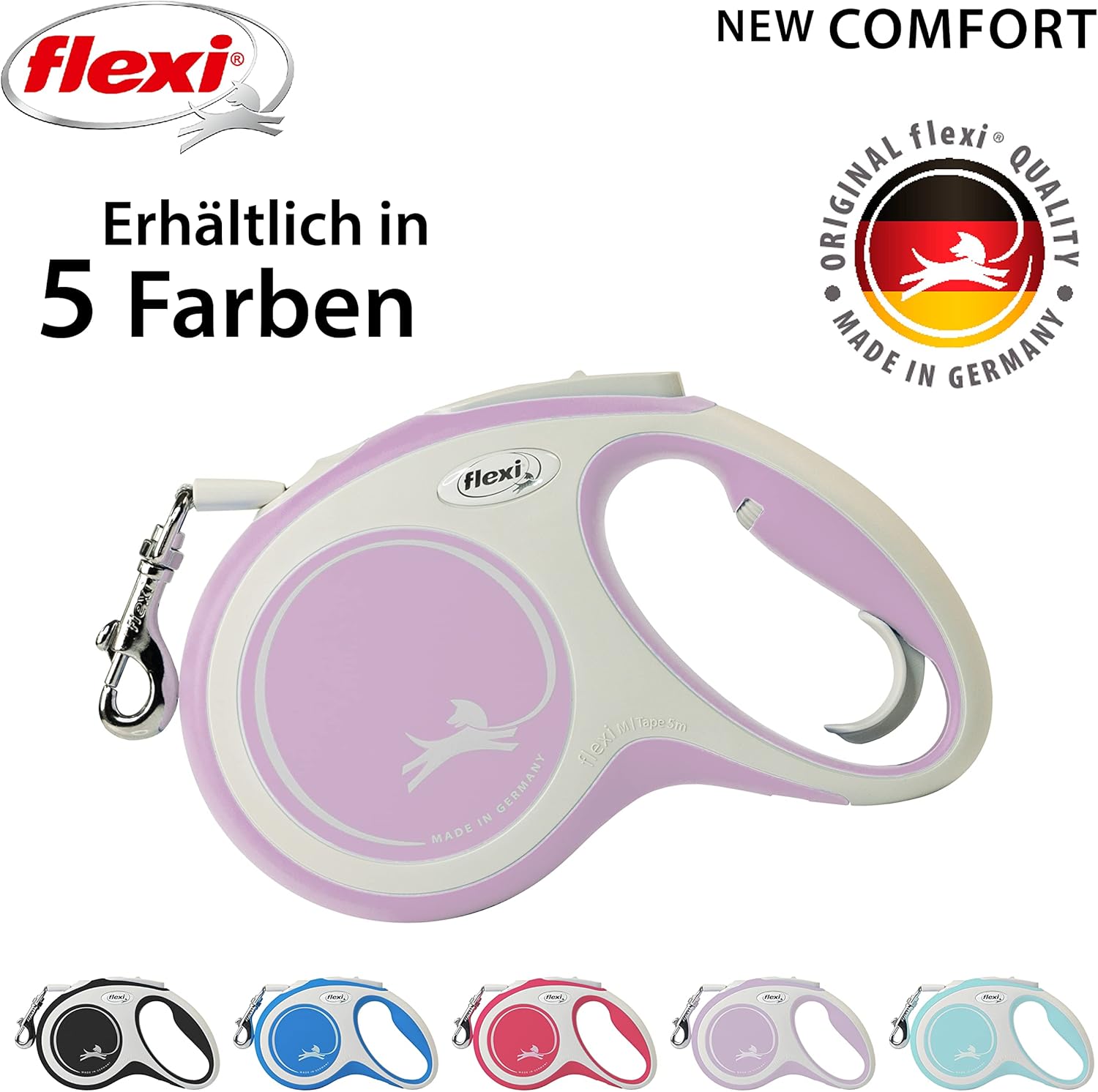 New Comfort е красиво проектирана, двуцветна прибираща се каишка с ергономична и регулируема дръжка. Може да се персонализира с аксесоарите Multi Box и LED Lighting System (за размер S и по-големи). Със своята иновативна спирачна система Short-Stop, New Comfort предлага високо ниво на безопасност и комфорт по време на разходки. Гъвкавите прибиращи се каишки никога не се разхлабват напълно, тъй като винаги са под леко напрежение. Благодарение на интегрираната спирачна система, винаги можете да насочвате и командвате кучето си. Чрез натискане на бутона на спирачката с палец и леко издърпване на каишката, можете да давате кратки команди на кучето си или да ги връщате обратно към вас. Допълнителна функция за постоянно спиране ви позволява да заключите каишката на определена дължина.