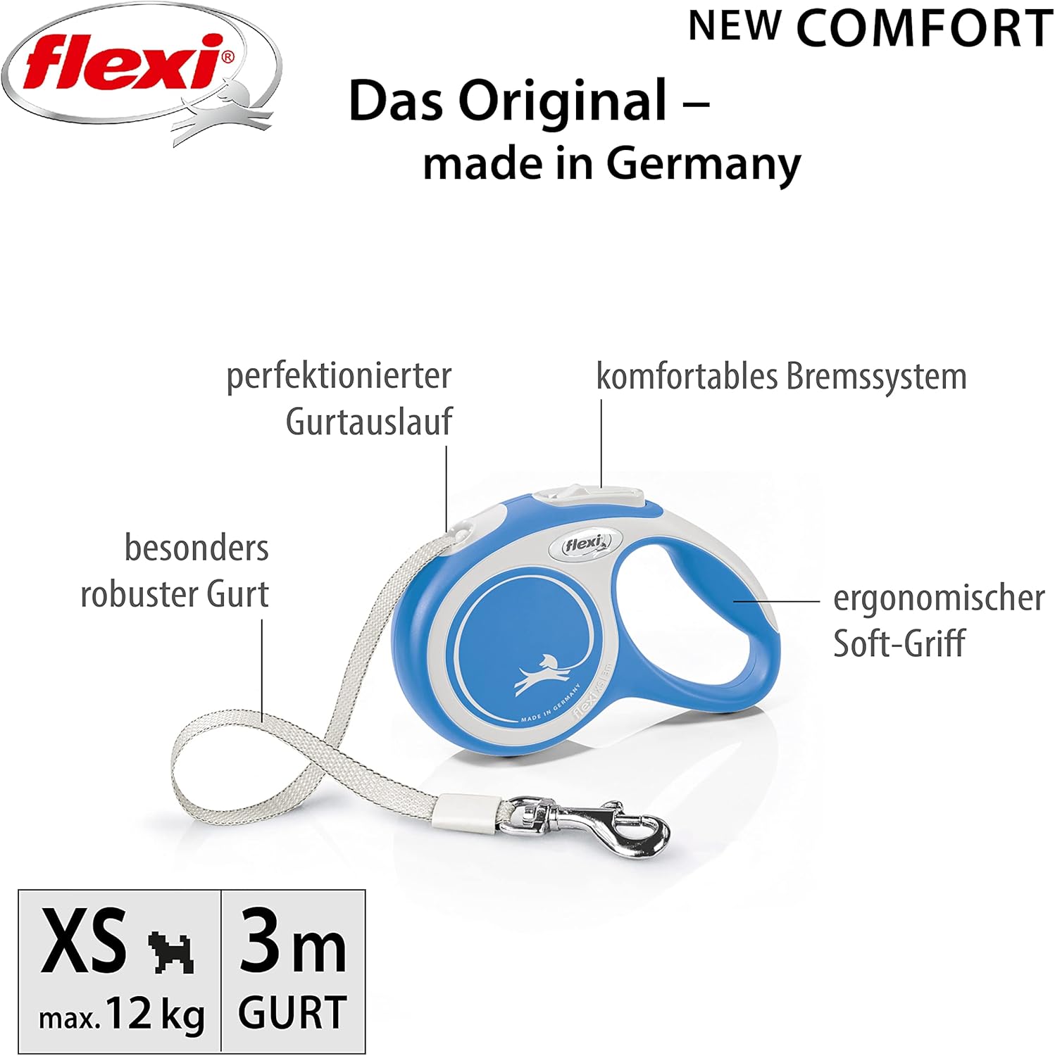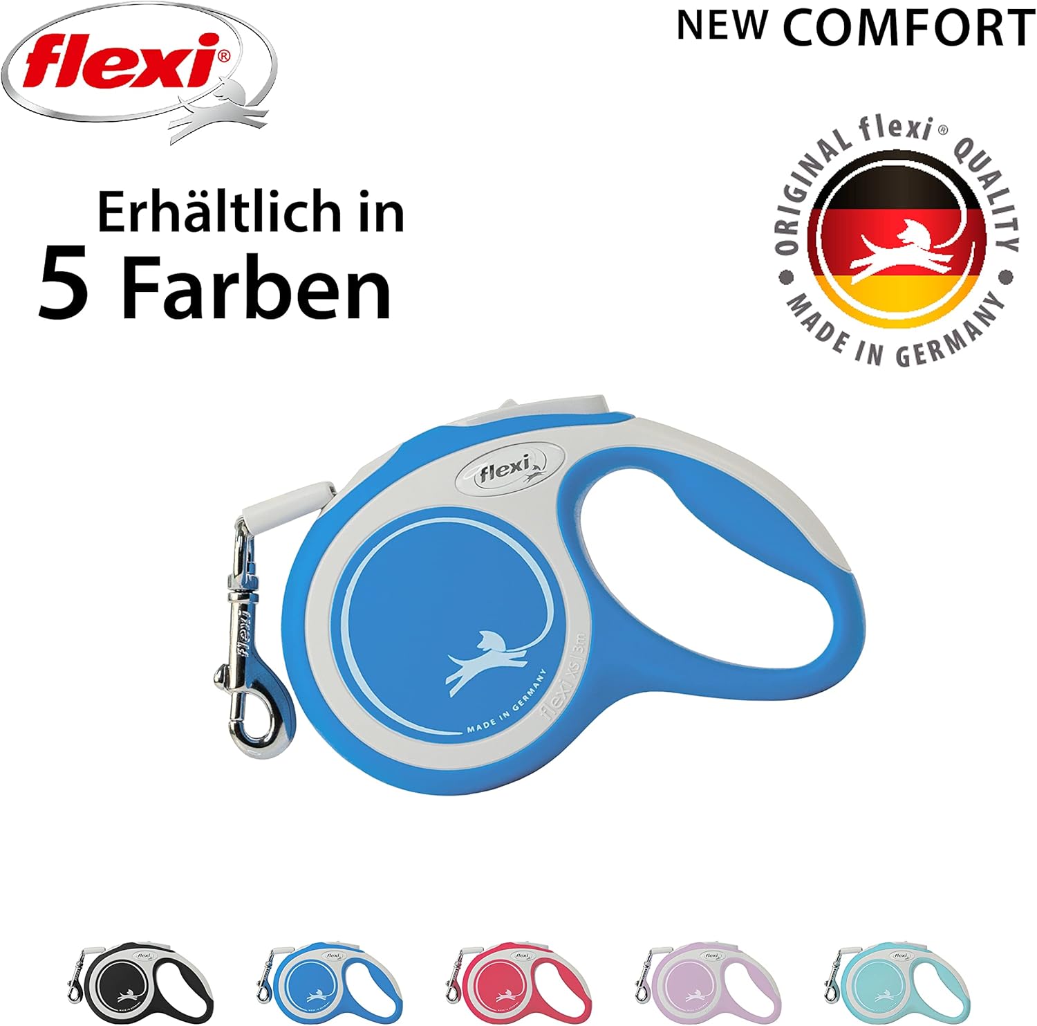 New Comfort е красиво проектирана, двуцветна прибираща се каишка с ергономична и регулируема дръжка. Може да се персонализира с аксесоарите Multi Box и LED Lighting System (за размер S и по-големи). Със своята иновативна спирачна система Short-Stop, New Comfort предлага високо ниво на безопасност и комфорт по време на разходки. Гъвкавите прибиращи се каишки никога не се разхлабват напълно, тъй като винаги са под леко напрежение. Благодарение на интегрираната спирачна система, винаги можете да насочвате и командвате кучето си. Чрез натискане на бутона на спирачката с палец и леко издърпване на каишката, можете да давате кратки команди на кучето си или да ги връщате обратно към вас. Допълнителна функция за постоянно спиране ви позволява да заключите каишката на определена дължина.