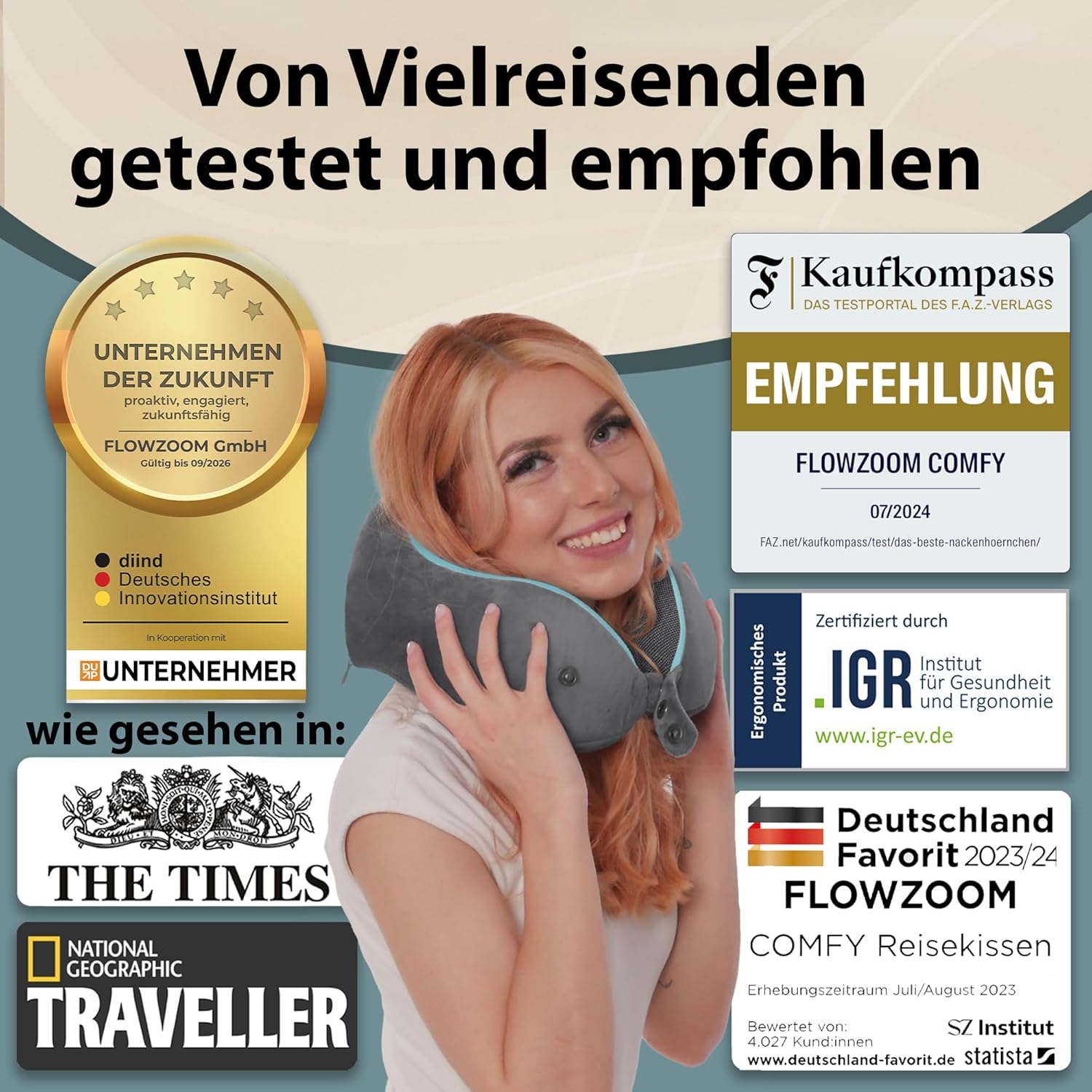 • Уникален дизайн – възглавницата за врата FLOWZOOM поддържа главата в перфектна позиция благодарение на изключително тясната облегалка, която не притиска главата напред в сравнение с други възглавници за самолети.