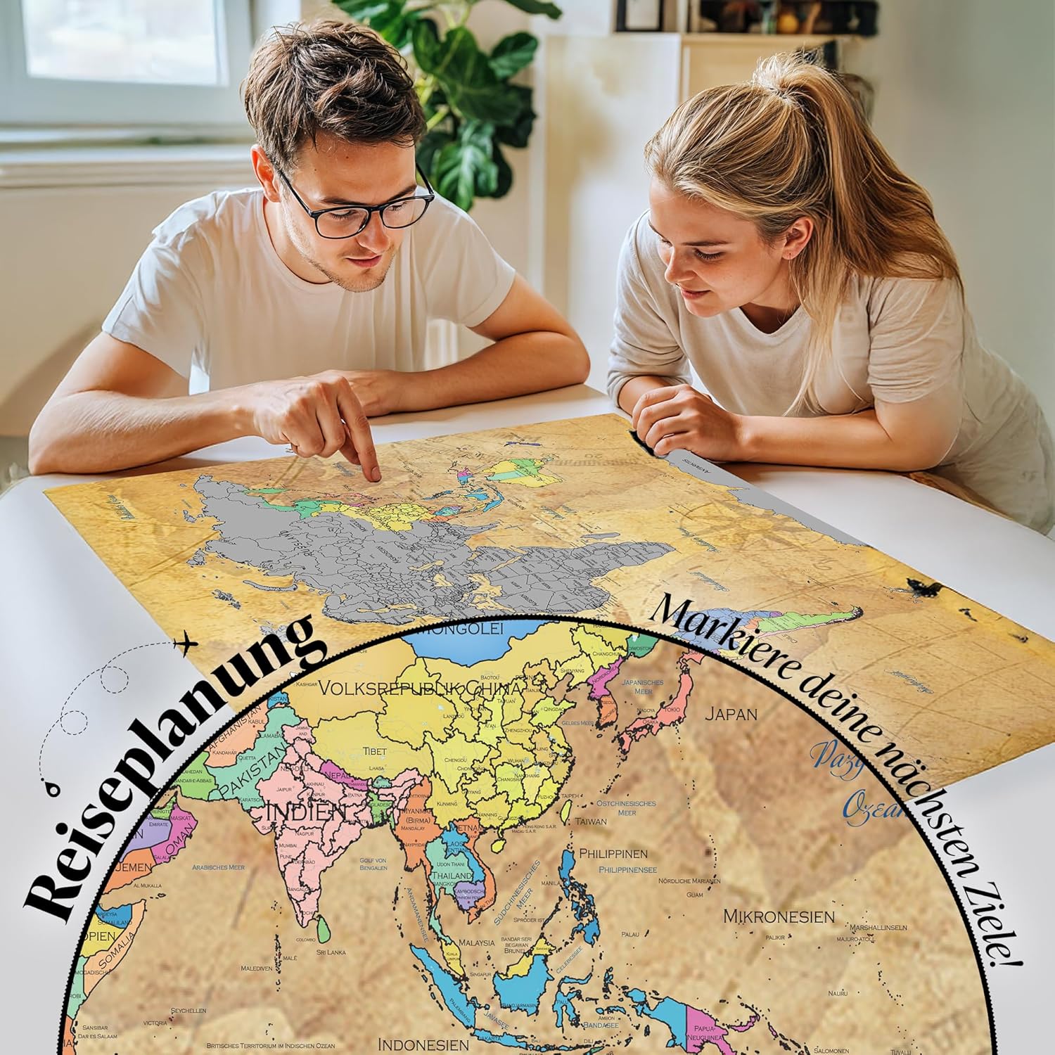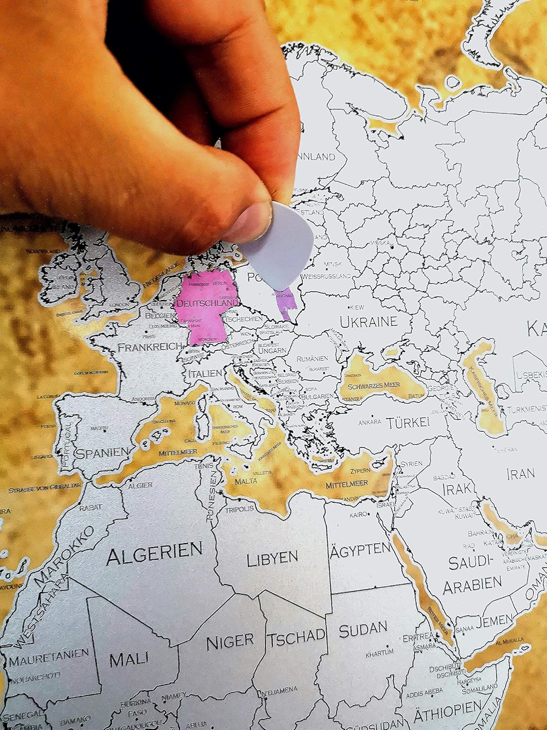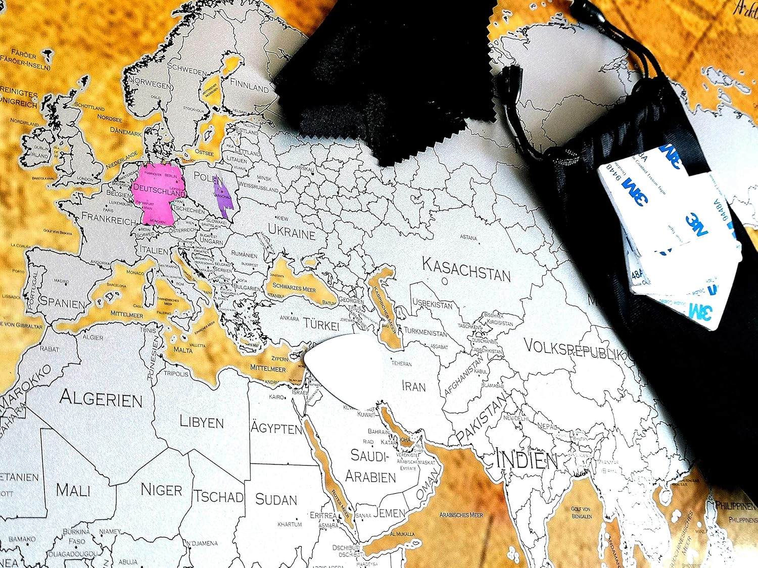 Първо залепете картата с включените двустранни лепящи ленти върху желаната стена. Не са необходими дупки или пролуки в стената. Надраскайте черното фолио на съответните държави, острови и др. с включените драскотини или монета и се насладете на цветния цвят под красивия слой.
