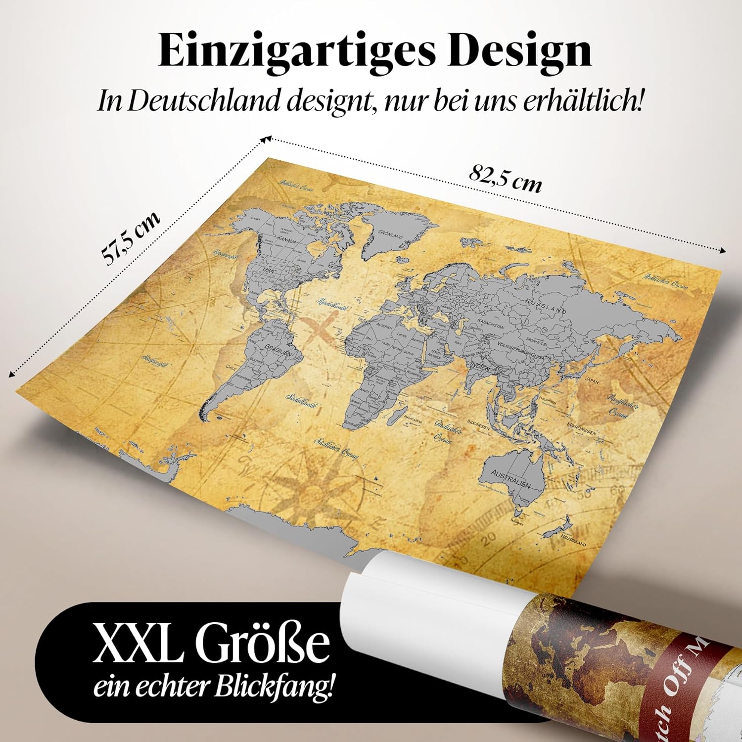 1 XXL карта на света с размери 82,5 x 57,5 см, 1 много красива ролка като опаковка, 6 големи двустранно залепващи 3M стикера за закачане на картата, 1 инструмент за драскане за перфектно драскане, 1 микрофибърна кърпа за поддържане на картата идеално чиста.