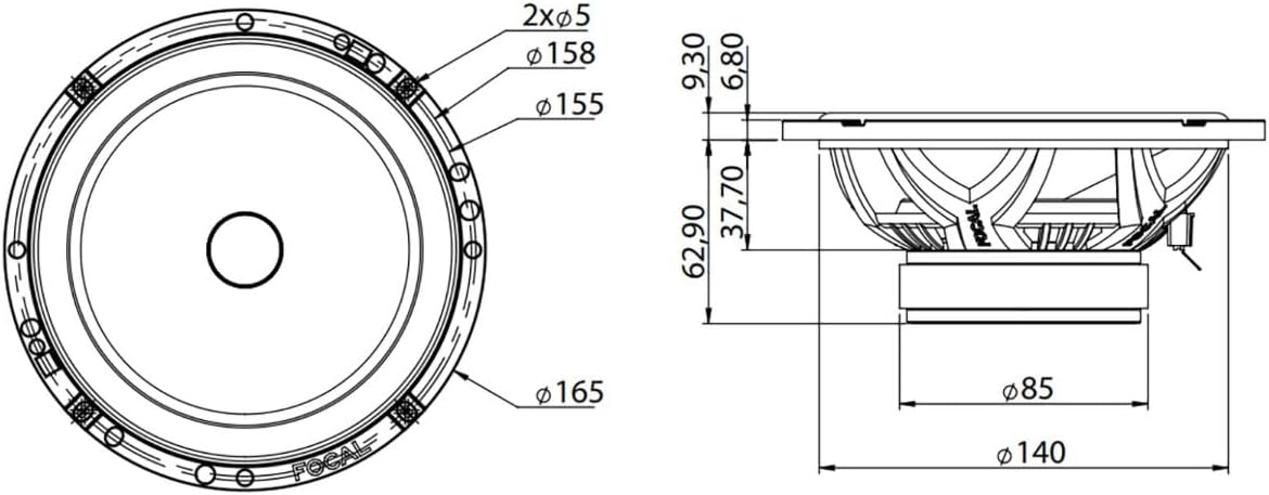 Focal A165AS | 16 см 2-лентова високоговорителна система, 2 x 165 мм компонентни високоговорителя, честотна лента: 60Hz - 20kHz, номинален импеданс: 4 ома, чувствителност 2.83V/1m: 91.3dB, номинална мощност: 60Wrms, максимална мощност: 120W, нискочестотен високоговорител: 165 мм фибростъклен конус, регулируемо ниво на високочестотния високоговорител: -3/0/+3 dB, монтажен диаметър: 141 мм, монтажна дълбочина: 62.9 мм