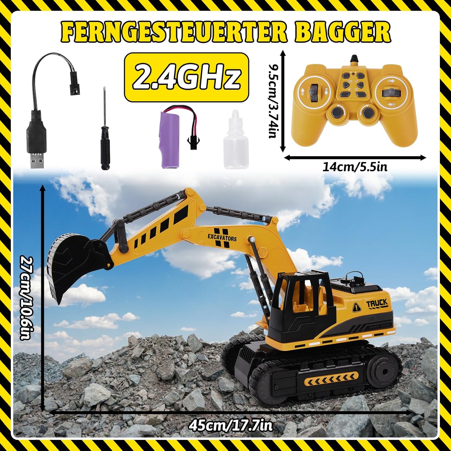 • Играчка багер за деца – дистанционно управляваният багер съдържа 1 RC багер, 1 дистанционно управление, 2 x 3.7 V 500 mAh батерии, 1 USB кабел за зареждане, 1 пипета, 1 отвертка. RC багерът е най-добрият подарък за опитни ентусиасти на дистанционното управление и деца.