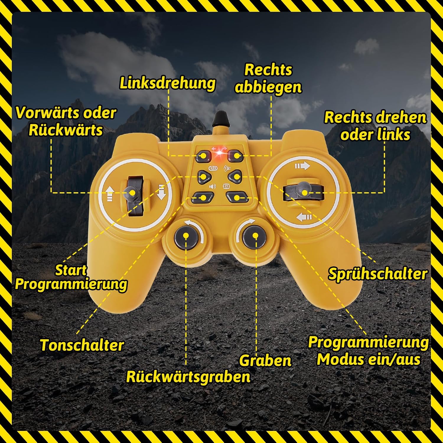 • Автоматична демонстрация - Тозият RC багер има автоматична демонстрация с един бутон, която помага на децата да работят с него. Багерът има функция за пръскане, което позволява на децата да се насладят на истинска изкопна работа.