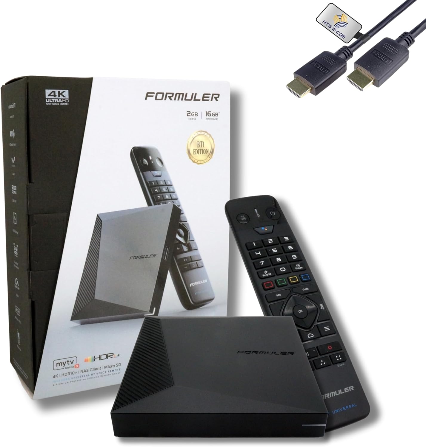 • Съдържание на кутията: 1 x Formuler Z11 Pro Max BT1 Edition, 1 x Bluetooth дистанционно управление, 1 x HTS e-com HDMI кабел, 1 x захранване, 1 x външен инфрачервен приемник, 1 x батерии