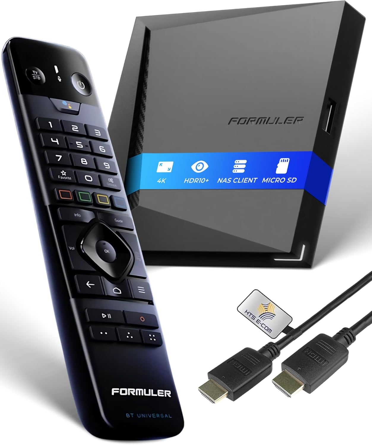 • Съдържание на кутията: 1 x Formuler Z11 Pro Max BT1 Edition, 1 x Bluetooth дистанционно управление, 1 x HTS e-com HDMI кабел, 1 x захранване, 1 x външен инфрачервен приемник, 1 x батерии