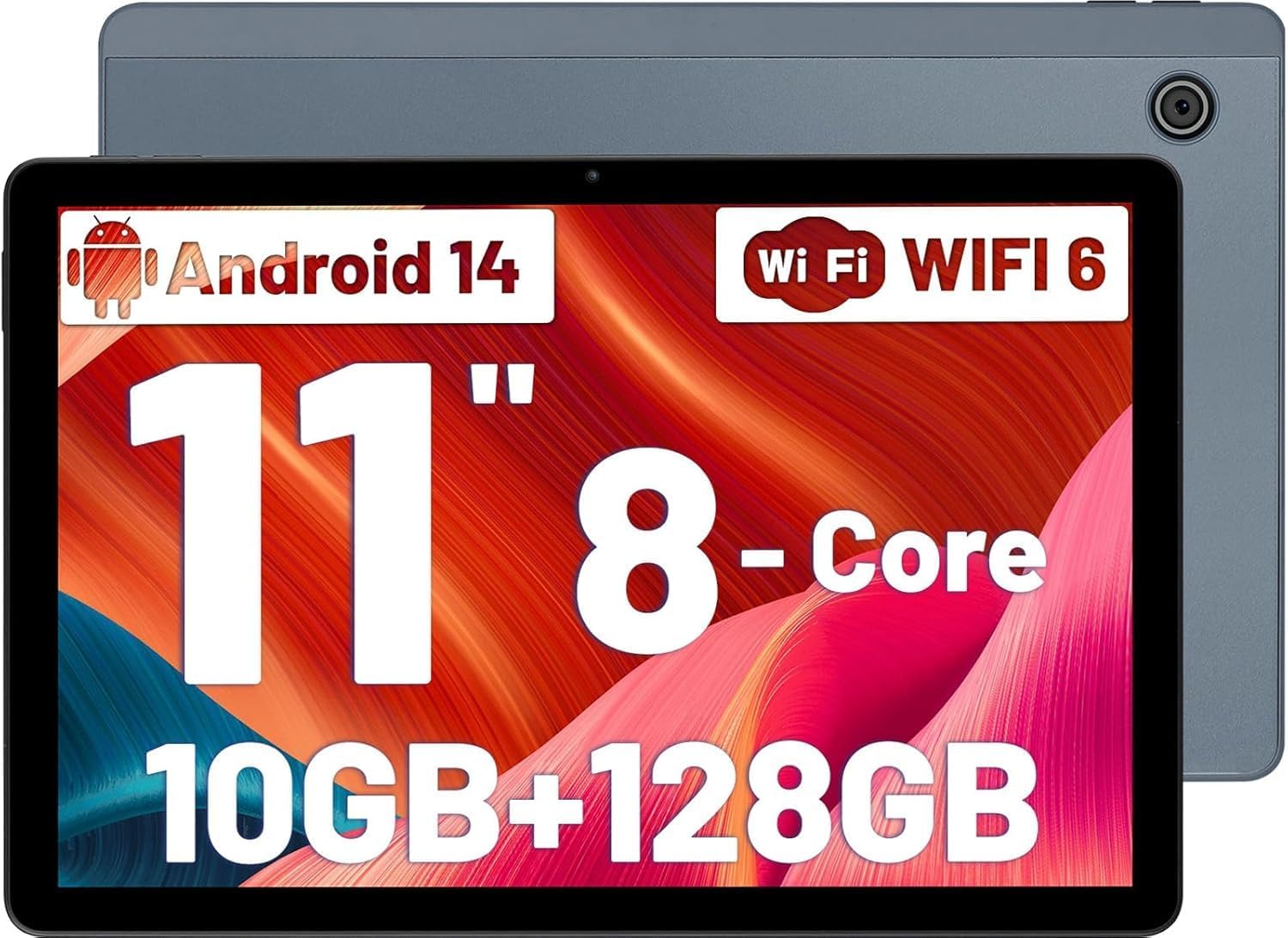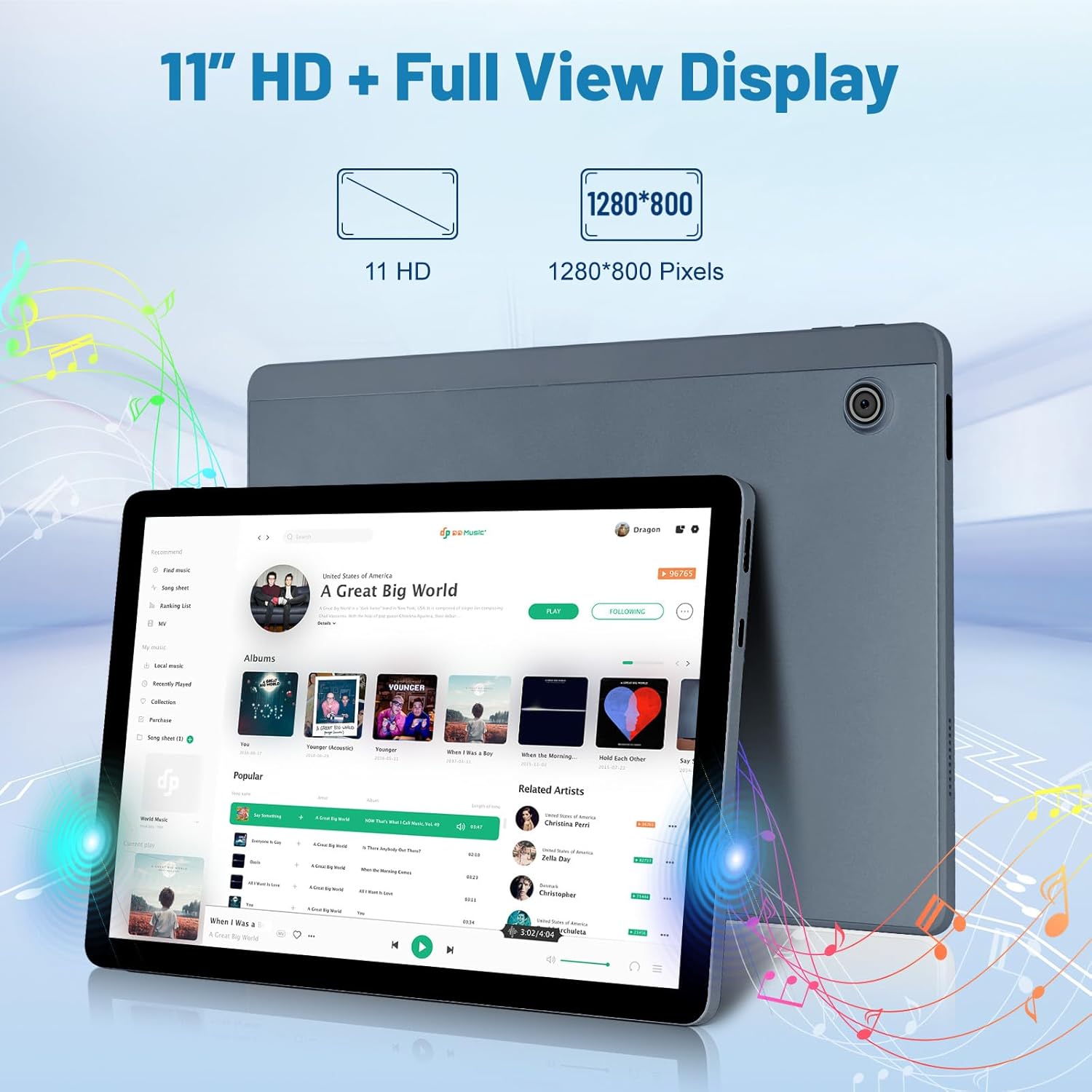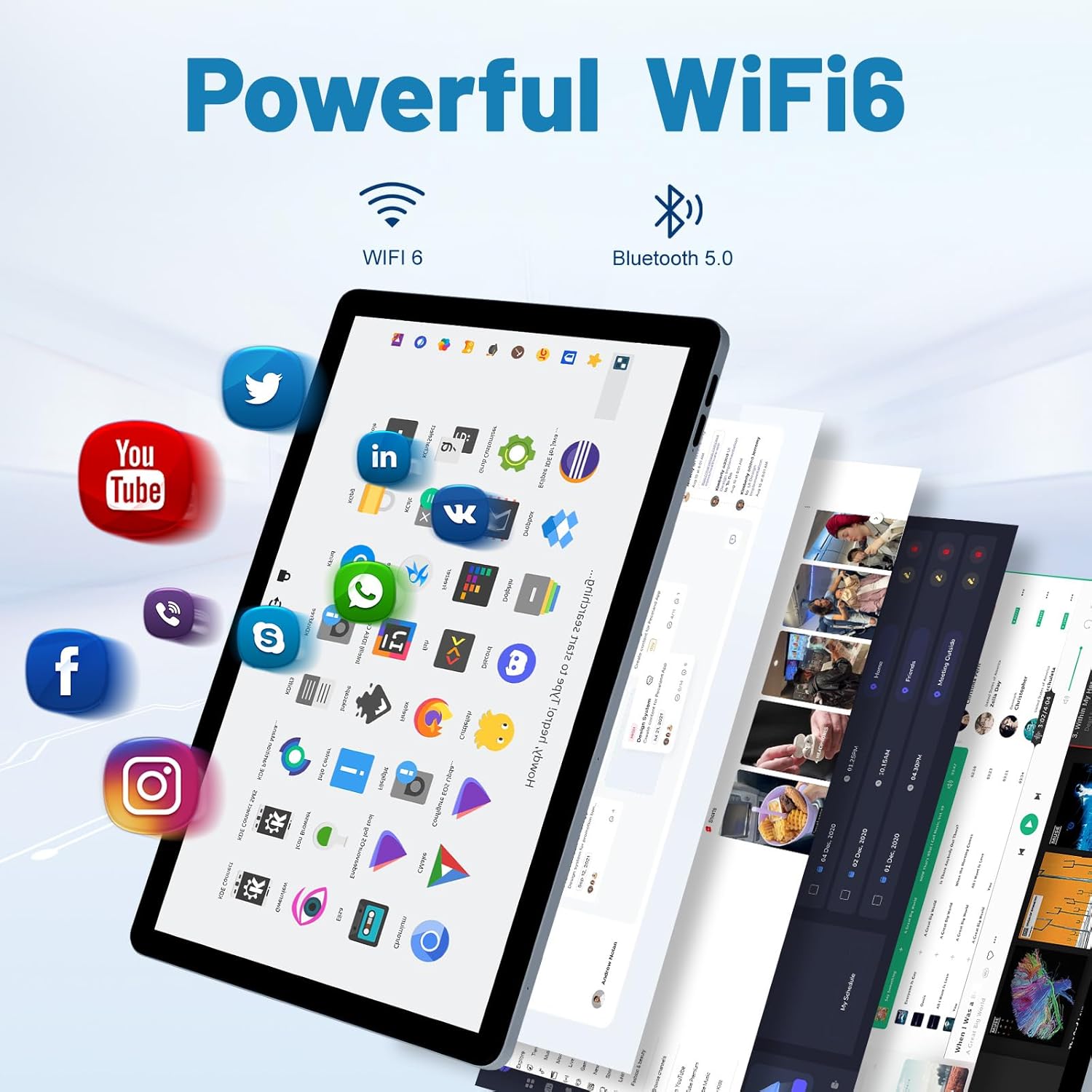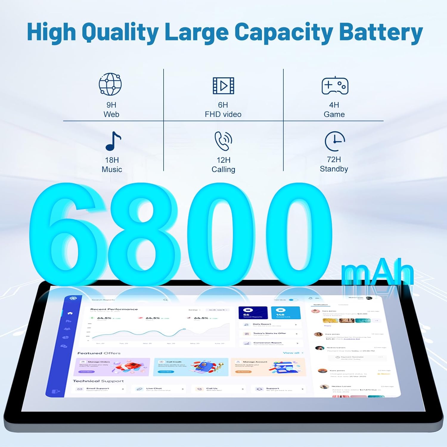 • 【10GB + 128GB + 1TB разширяема + 6800mAh батерия】11-инчовият сензорен таблет поддържа 6GB виртуална RAM памет в допълнение към 4GB RAM памет. Със 128GB вградена памет и Micro SD карта (не е включена) до 1TB, той поддържа капацитет за съхранение. С батерия от 6800mAh и два високоговорителя, ще се насладите на плавно изживяване, дори когато гледате видеоклипове, сърфирате в интернет и слушате музика.