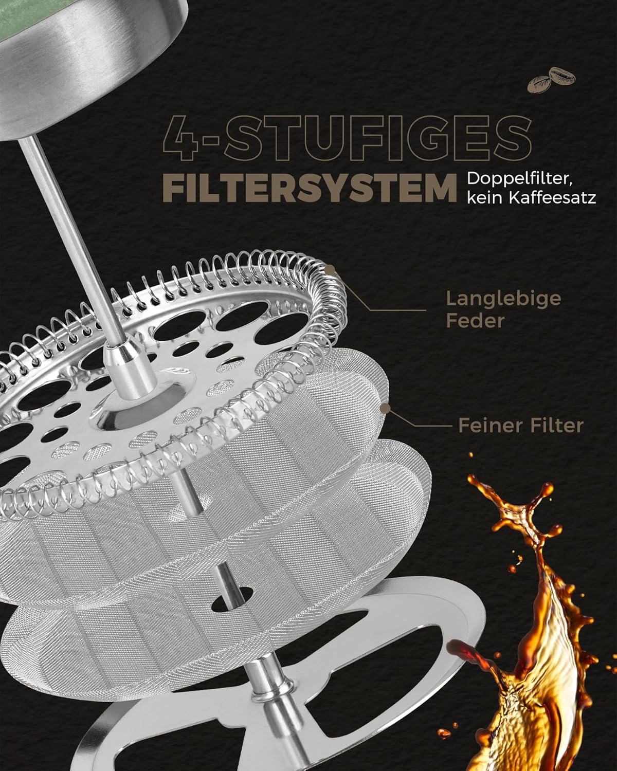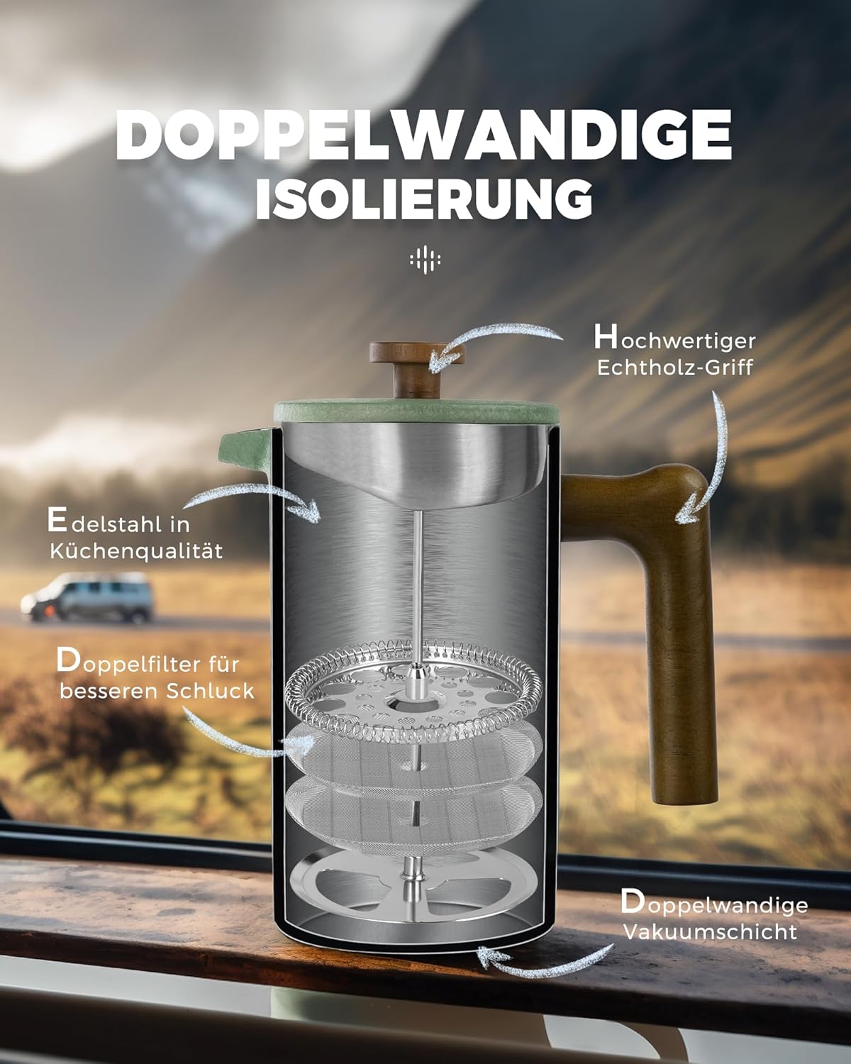 • Двустенна изолация: Нашата кафеварка с двуслойна конструкция е изработена от двустенна неръждаема стомана, така че можете да поддържате кафето си топло за по-дълго време, отколкото стъклена френч преса. Средно напитките остават топли за 60 минути по-дълго. Следователно, кафеварката поддържа кафето или чая топли за по-дълго време, като при допир отвън не се усеща твърде горещо.