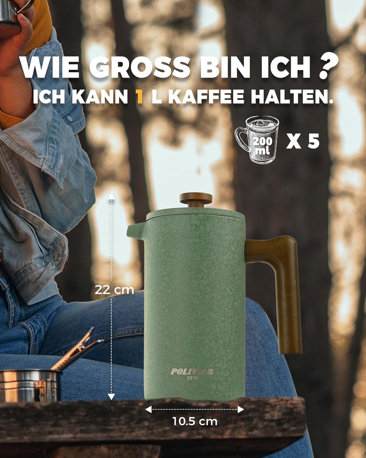 Френч преса Poliviar, неръждаема стомана, термо кафемашина, двустенна изолация, кафемашина 1 литър, ръчна филтърна преса за кафе с бутало и дървена дръжка, преса за кафе (зелена)