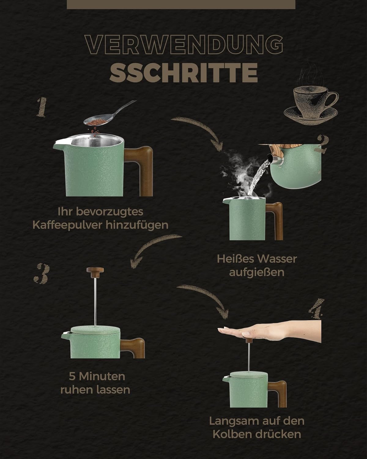 • Перфектни подаръци: Идеална като машина за кафе или чай. Подходяща също за горещо мляко, шоколад, плодов чай, лимонада. Независимо дали сте у дома или на път, за къмпинг, пътуване или пикник, тази преса за кафе е незаменим спътник. Идеален подарък за всички любители на кафето, любители на „Направи си сам“ и здравословни гастрономи!