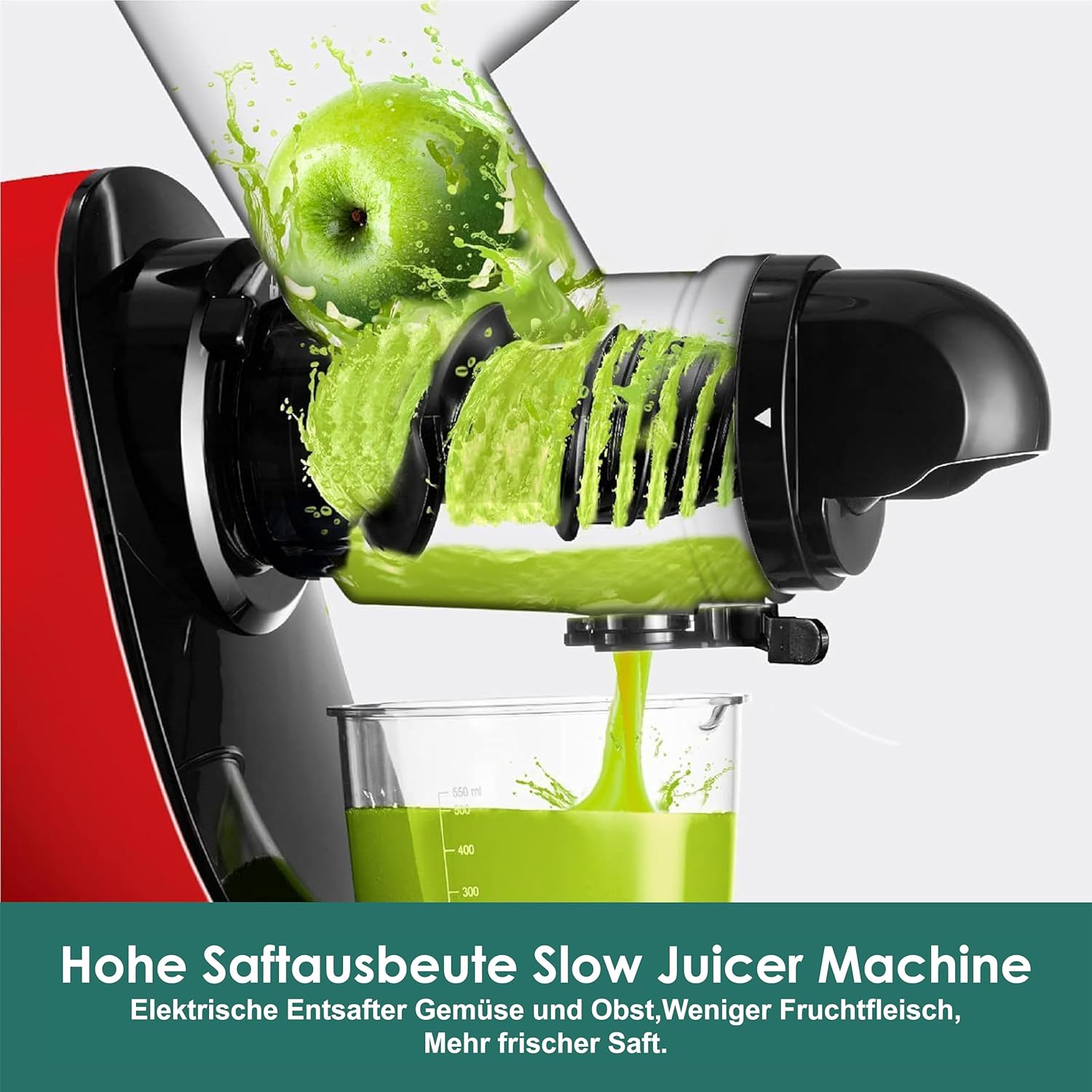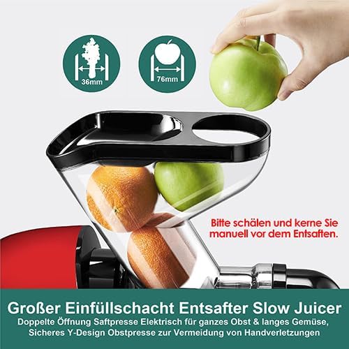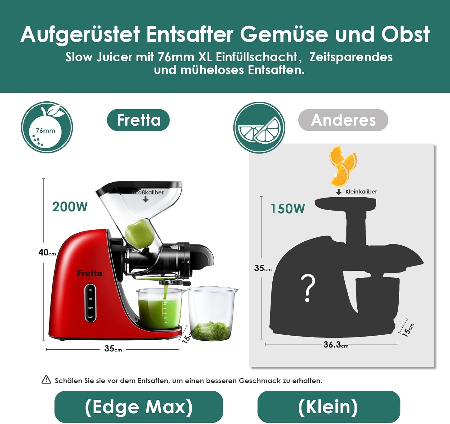 Fretta Бавна сокоизстисквачка, сокоизстисквачка за зеленчуци и плодове, победител в теста за зеленчуци, отвор 76 мм, преса за плодове, електрическа сокоизстисквачка, сокоизстисквачка за ябълки и целина, преса за зеленчуци, без BPA, лесно почистване, червена