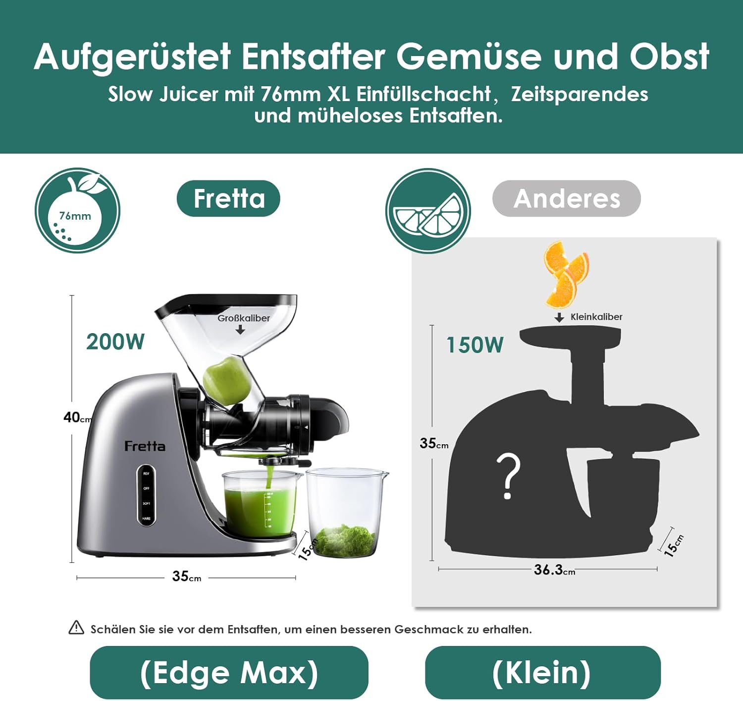 • Мощен, но тих мотор: Fretta бавна сокоизстисквачка, победител в теста за сок от моркови и целина, се захранва от здрав 200 W DC мотор. Дизайнът с висок въртящ момент и ниска скорост работи тихо и извлича хранителните вещества от любимите ви плодове и зеленчуци. Тази електрическа преса за плодове и портокали работи под 70 dB, така че не безпокои съседите и семейството ви.