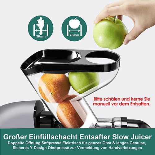 Fretta Сокоизстисквачка Бавно изстискваща машина за зеленчукови и плодови сокове, преса за плодове, електрическа сокоизстисквачка 76 мм XL отвор, сокоизстисквачка, студено изстискваща, без BPA, лесна за почистване, сребриста