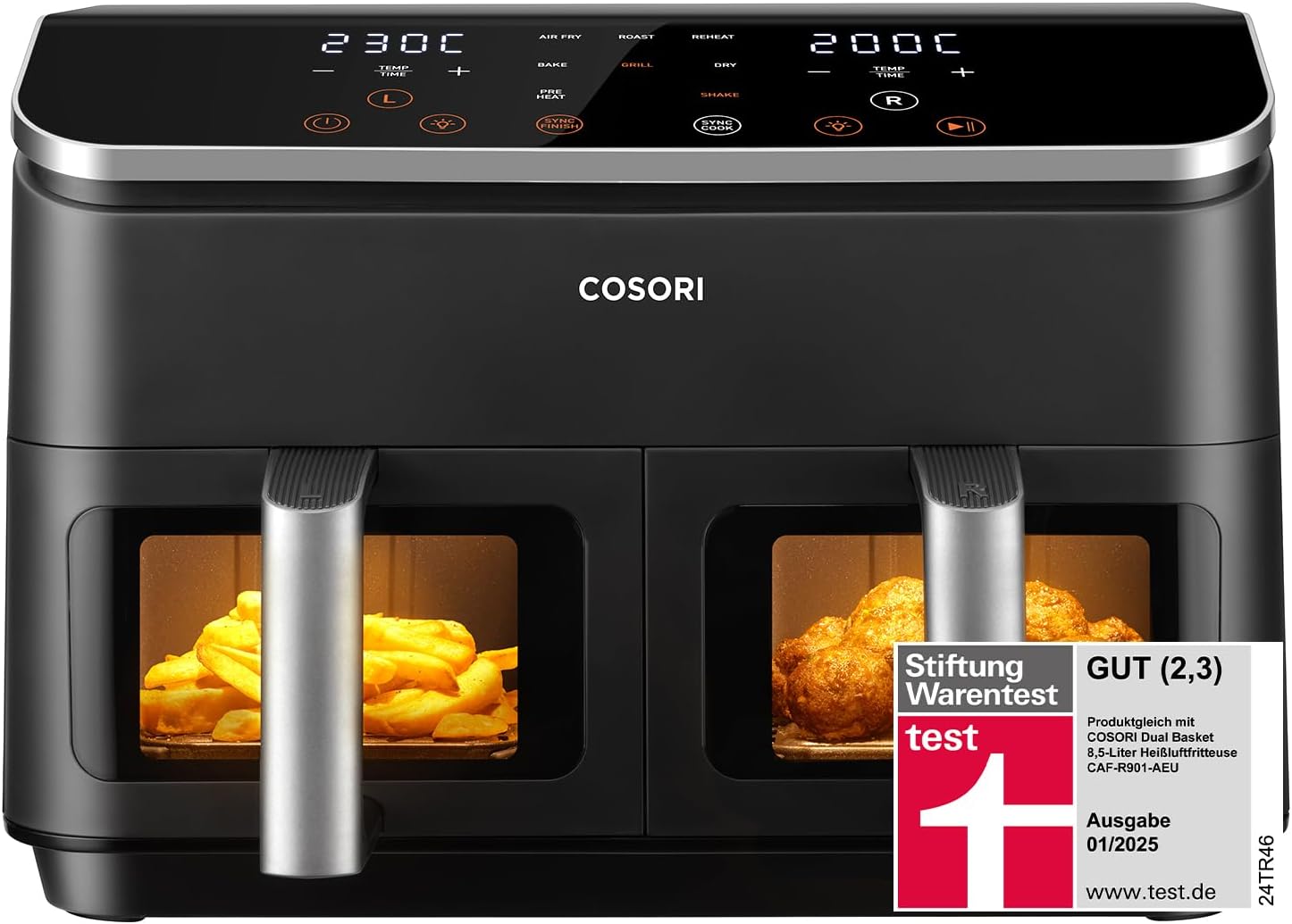 Фритюрник COSORI с горещ въздух и 2 камери, 8-в-1 двойна зона XXL 8.5L, разполага с двукамерен дизайн с прозорци за балансирани ястия; Включва 50 рецепти, пести енергия и е подходящ за 1-5 души