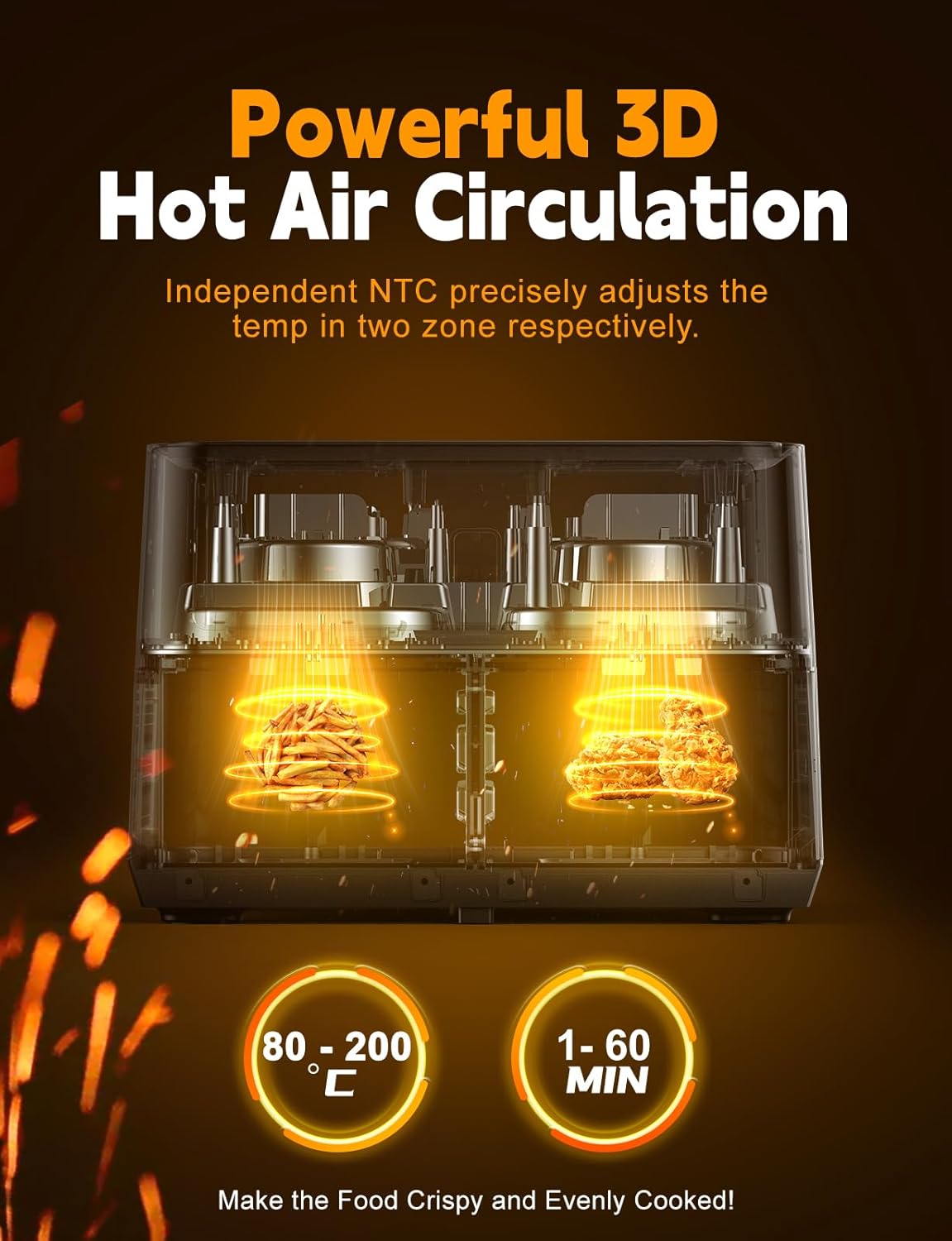 Фритюрник с горещ въздух, 2 камери с прозорец за наблюдение, 10 л двузонов XXL фритюрник с горещ въздух, 10 предварително зададени програми, сензорен екран, интелигентна синхронизация и таймер, енергоспестяващ, фритюрник без олио