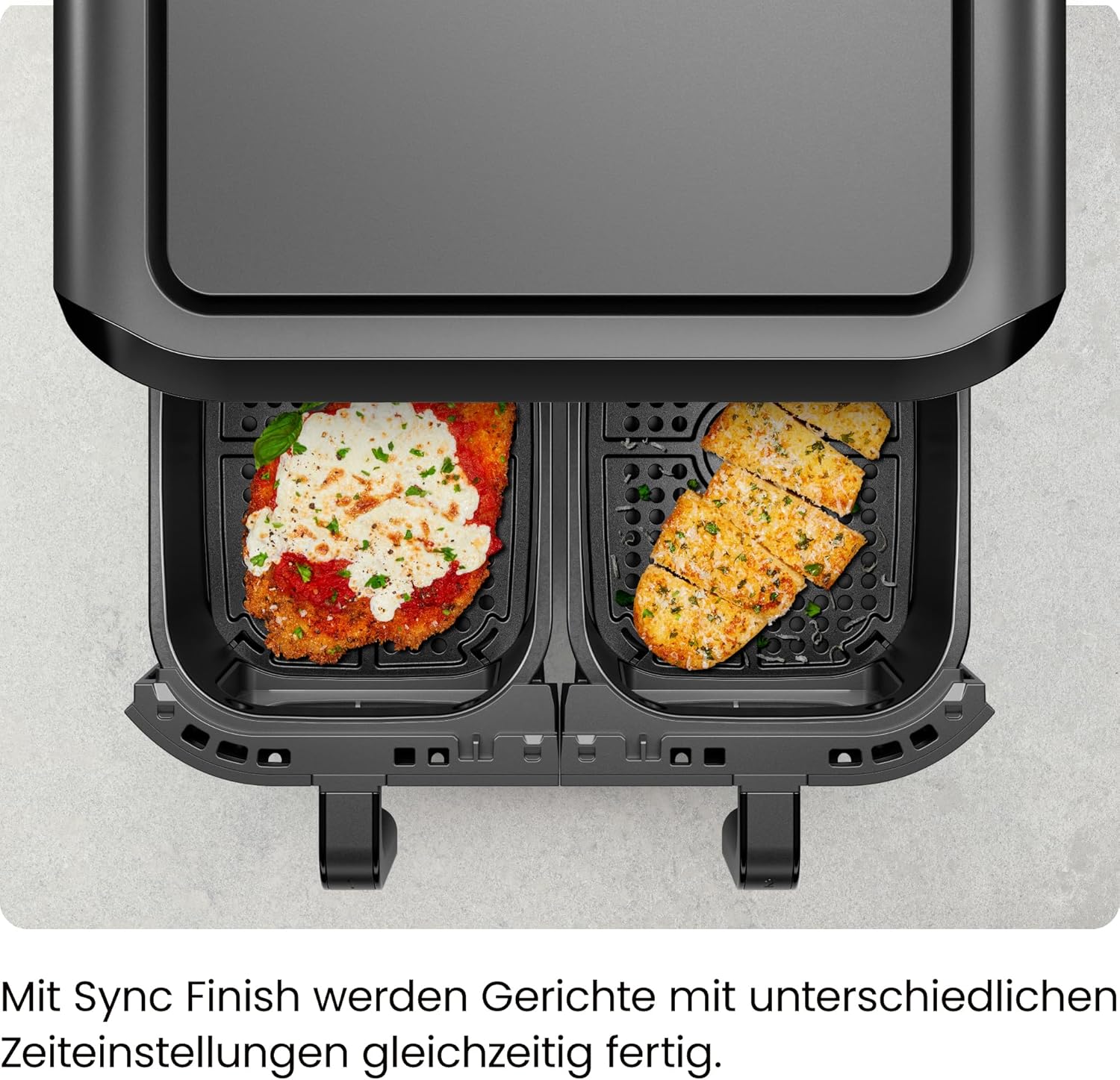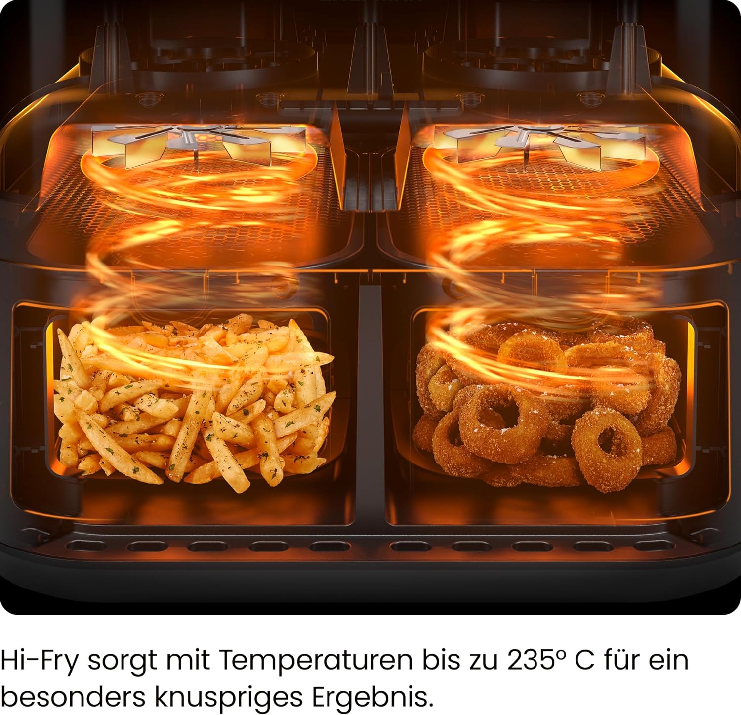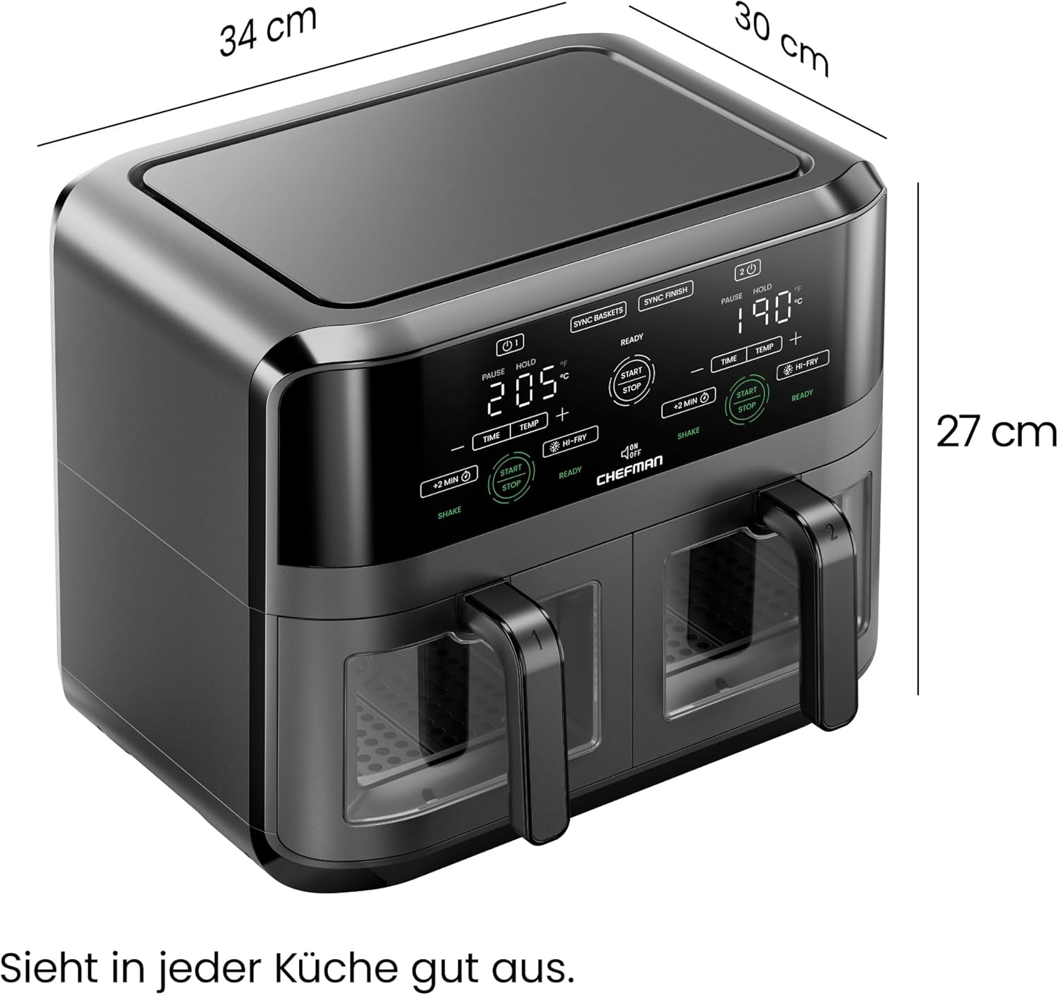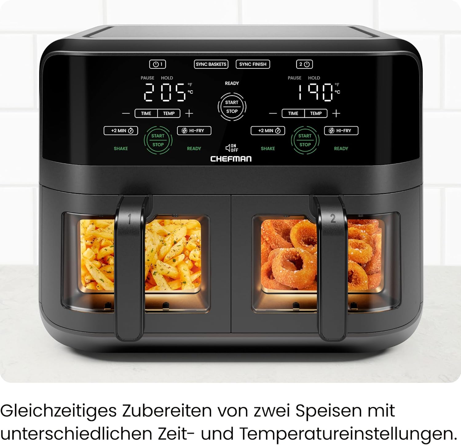 Фритюрник с горещ въздух CHEFMAN 5,6 литра с двойна кошница и прозорец за лесна видимост, синхронизирано покритие, Hi-Fry, автоматично изключване, подходящ за съдомиялна машина, 2100 W, цифров, черен