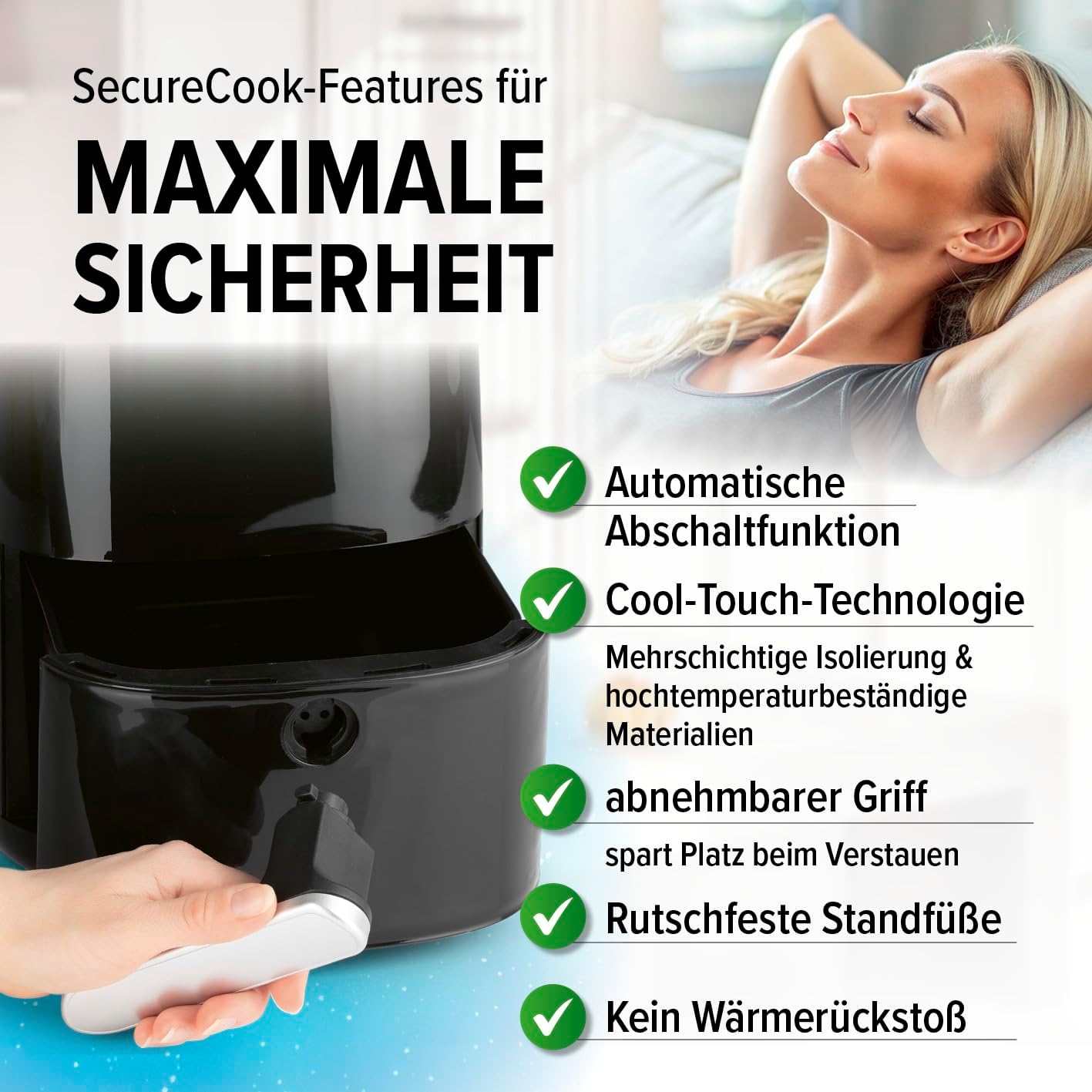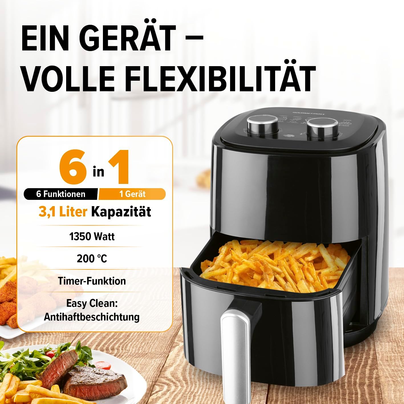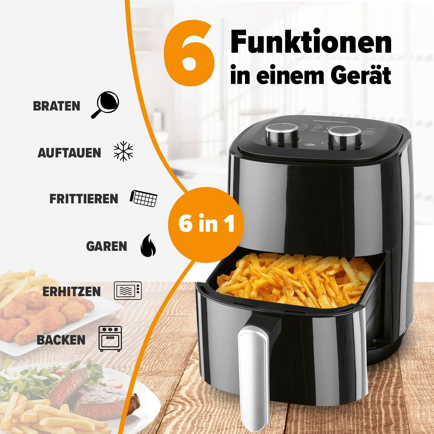 Пържете пържени картофи почти без излишна мазнина? С компактния фритюрник с горещ въздух от GOURMETmaxx за 2-4 души, можете да го направите. Умната комбинация от бързо циркулиращ горещ въздух и нагревателен елемент не само готви любимите ви храни с особено ниска миризма, бързо и нежно; също така изисква до 80% по-малко мазнини и по-малко енергия от конвенционалната фурна. Така получавате сочни отвътре и красиво хрупкави резултати отвън. Универсалният мултикухненски инструмент е идеален за малки домакинства и ви предоставя и 6 различни функции: безпроблемно пържене, печене, готвене, затопляне и размразяване. Освен това, компактният 3,1-литров универсален уред ви предлага 1350 вата мощност, интелигентна функция за 60-минутен таймер, функция за автоматично изключване и общо 6 препоръки за приготвяне, за да улесни още повече прецизното приготвяне на любимите ви храни, като пържени картофи, пържола, риба, пилешки крилца или кексове. С фритюрника с горещ въздух GOURMETmaxx можете да откривате нови любими ястия всеки ден - бързо и без усилие. С неплъзгащи се крачета, технология Cool Touch и кошница и решетка, подходящи за съдомиялна машина. Температурен диапазон 80-200°C.