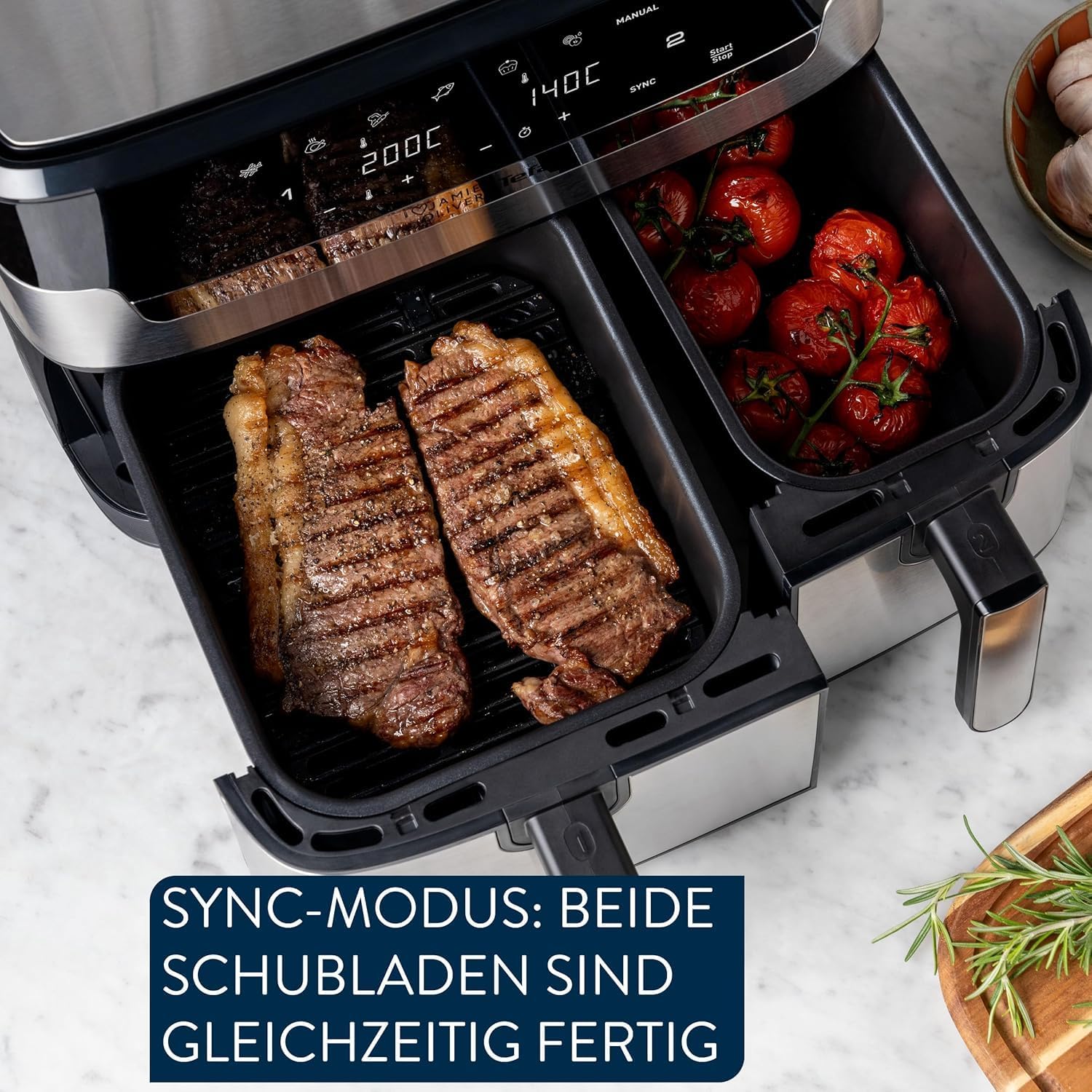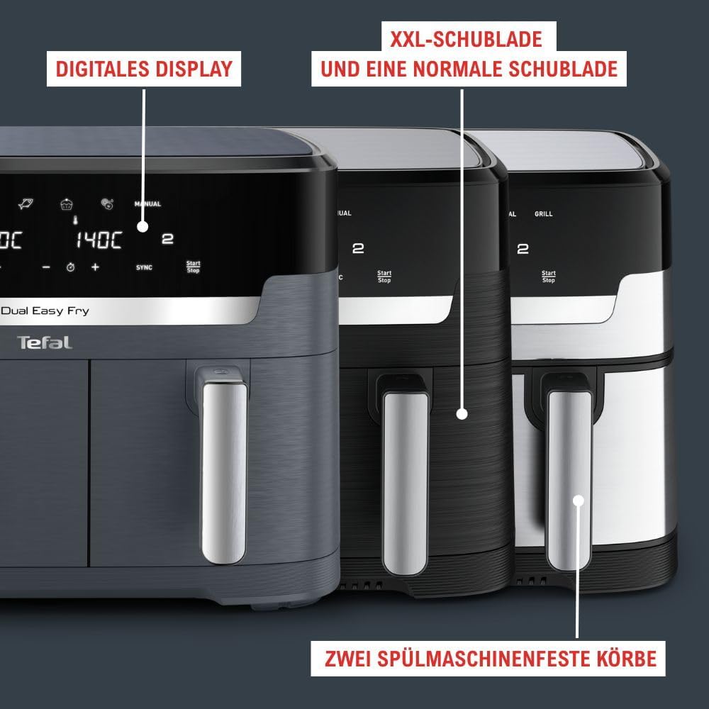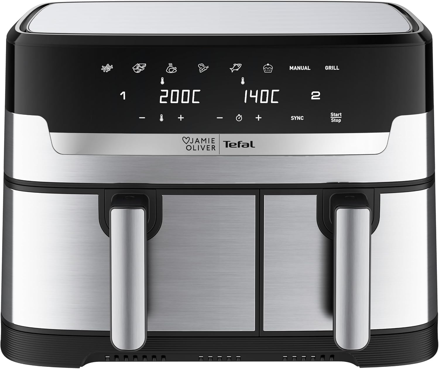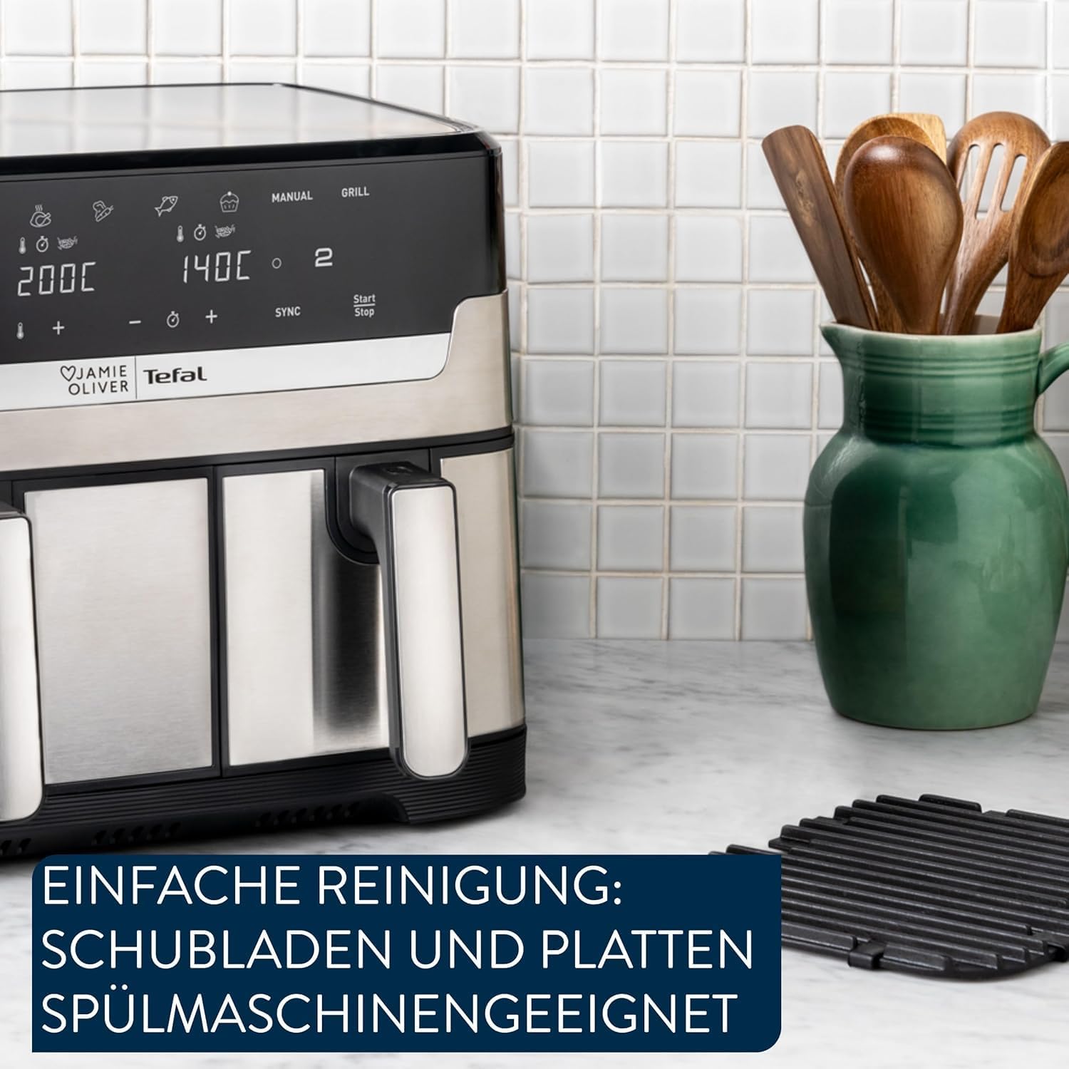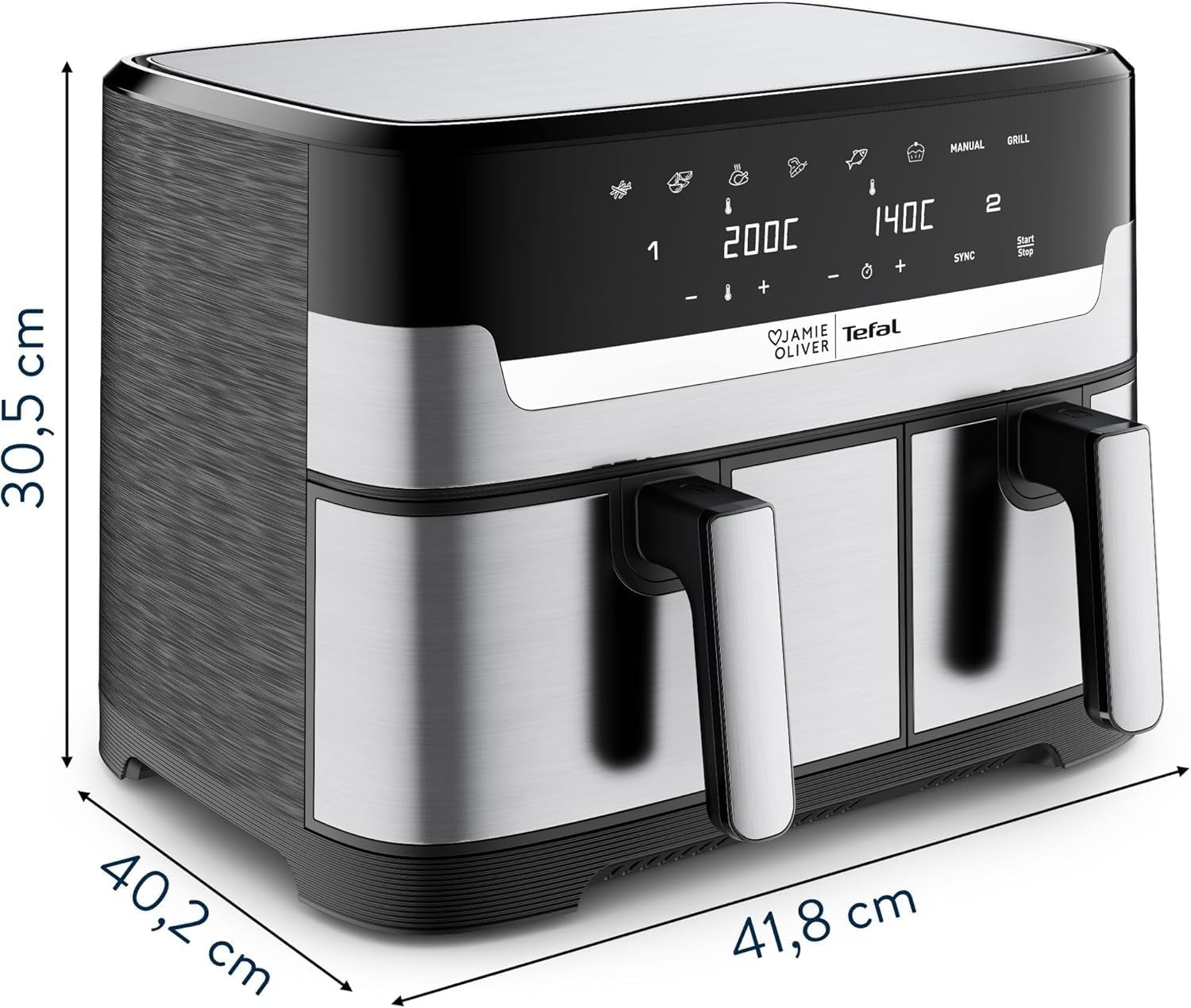 Фритюрник с горещ въздух Jamie Oliver by Tefal с две чекмеджета, двойна камера, 2 независими зони за готвене, 8 автоматични програми, общ капацитет 8,3 л, черен/неръждаема стомана, EY90JDE1